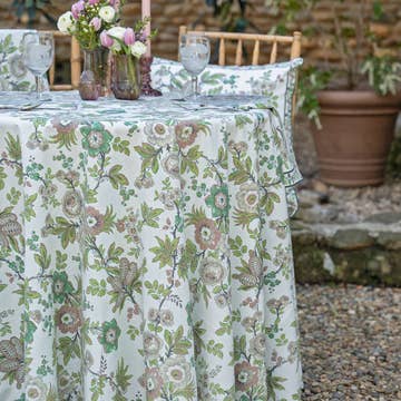 Set an elegant table with our Camellia Tablecloth. Crafted from 100% cotton, it offers a soft, natural drape that complements both everyday dining and special occasions whether holidays or wedding rehearsal dinner table. Complete the look with our coordinating linens for a timeless, effortless hosting decor. * Available in three sizes * Woven from 100% organic cotton. * Dyes free of harmful chemicals. * Sustainably sourced and ethically made in India.