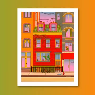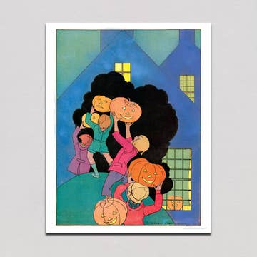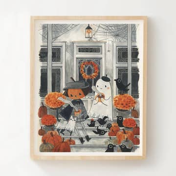 8W x 10H inch art print, giant panda bears dressed as a witch and ghost for Halloween, trick-or-treating in front of row houses in the Georgetown neighborhood of Washington, D.C.