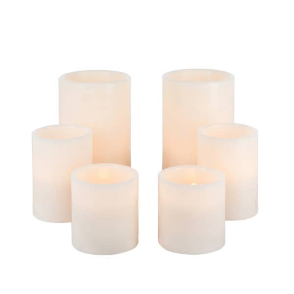 Set of 6 Bisque Wax 1000 Hour Candles. -- Bisque Color -- Straight Edge -- Soft Glow Flicker -- Requires 12AA Batteries, Not Included -- PKG: Color Window Box. Size: 3"D x 3"H, 3"D x 4"H, 4"D x 6"H.