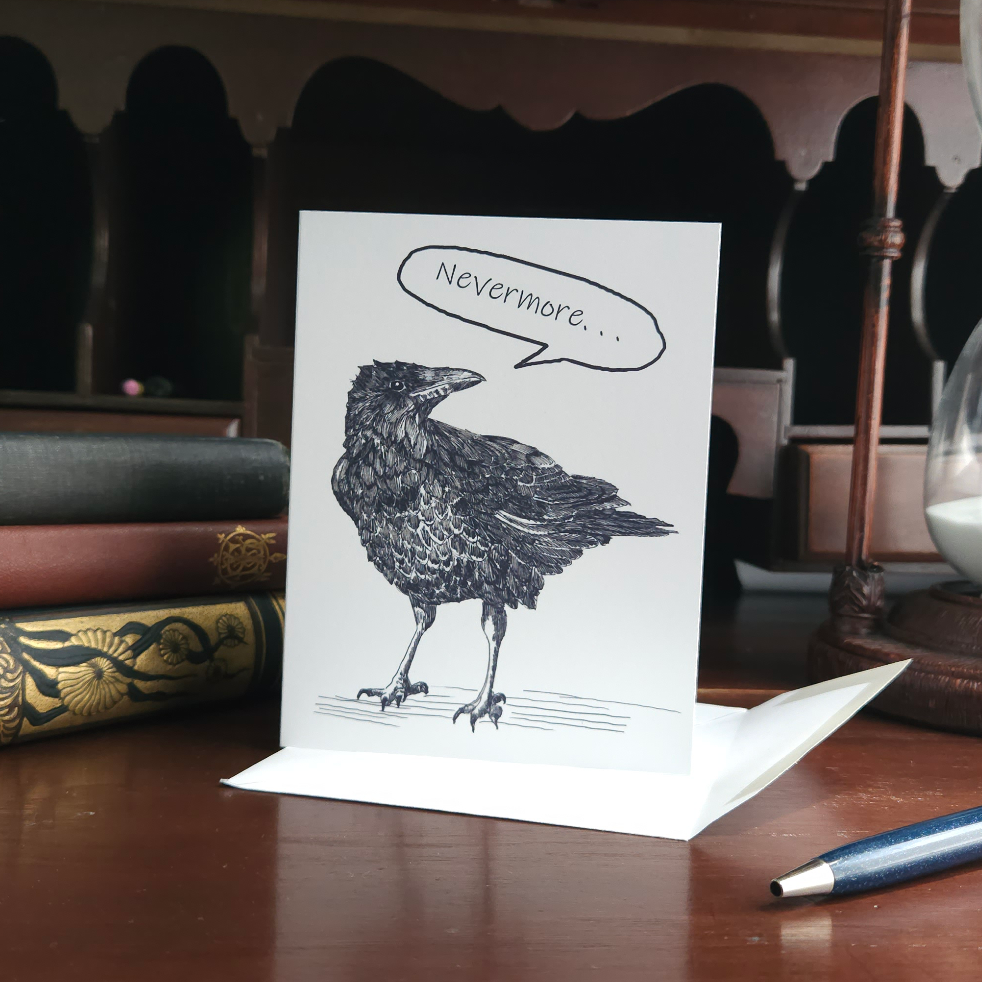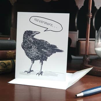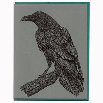 P6P-AT07 *Letterpress A2 card (4.25” x 5.5”), printed on cotton paper. *Comes with matching envelope. *Packaged in a recyclable sleeve. *Blank inside. Printed by hand in Washington State ---- What is Letterpress? Letterpress is a printing process that has been around since the middle ages. Once the standard for printing; metal or wood type is inked and pressed against paper. The technique produces an impression in the paper making it different from offset or digital printing. Each color is applied separately, some of our products go through the press five or six times. Letterpress is distinctive for its tactile quality and makes for a product guaranteed to impress. funny greeting card, pun card, crows card, everyday card, humor card, card for friends, card for love ones, gothic greeting card, halloween card, spooky card