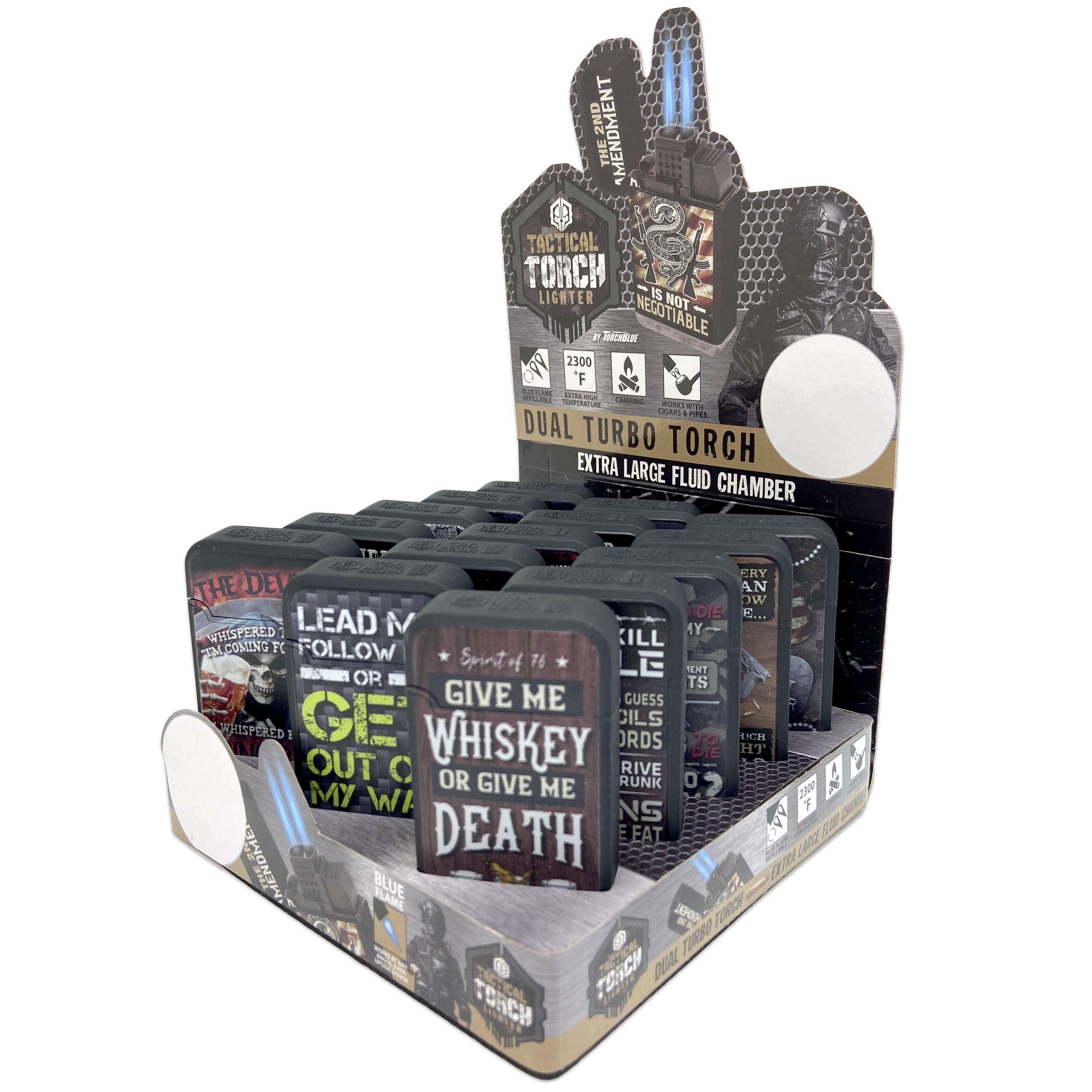 Tactical Dual Torch Lighters feature a 2300° blue flame, perfect for camping, cigars, pipes, and candles. Also has an extra large, refillable fluid chamber – you won't have to worry about this torch going out! Satirical phrase styles printed on soft touch comfort casing. WHOLESALE BULK ITEM