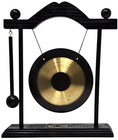 This exotic and finely detailed small brass desktop gong or chime wind bell set is aesthetically appealing and mainly decorative, but functional. It makes a reasonable sound when being tapped gently with the mallet. It is a cool addition to your desktop decor and will add flare to your place. This gong comes in handy to decorate your room or office to create a Zen Feng Shui zone, ornament a Japanese or Orient garden , accessorize an eastern style room, or accent a Chinese mystery dinner party. It does not take up much space and will look and fit great on top of a bookshelf, table, desk, curio cabinet, or mantel. As an adorable and whimsical piece of oriental art, this item is a good conversation piece.