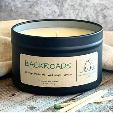 Pine and Sage Candles are handmade in Montana. Our candles are made with coconut wax and phthalate free fragrances for a clean and slow burn. Made in Montana with love. Fragrance Notes: Bergamot . Lemon . Orange Blossom . Jasmine . Sage Backroads has fresh scents of orange blossom, jasmine and wild sage. This candle reminds me of driving down a backroad with the windows rolled down, taking in the scenery, and savoring the sweet aroma of summer. Backroads is a candle that celebrates summer with the reminder to slow down and enjoy what season offers. Approximate burn time: 6 oz-40 hours 2 oz-15 hours Tester Size: 2 oz mini tin. Candle tins are a great alternative to glass, please reuse or recycle. Easy to ship, take on a trip, or give as a gift! All products are made to order and we do our best to get your order shipped out as quickly as possible!