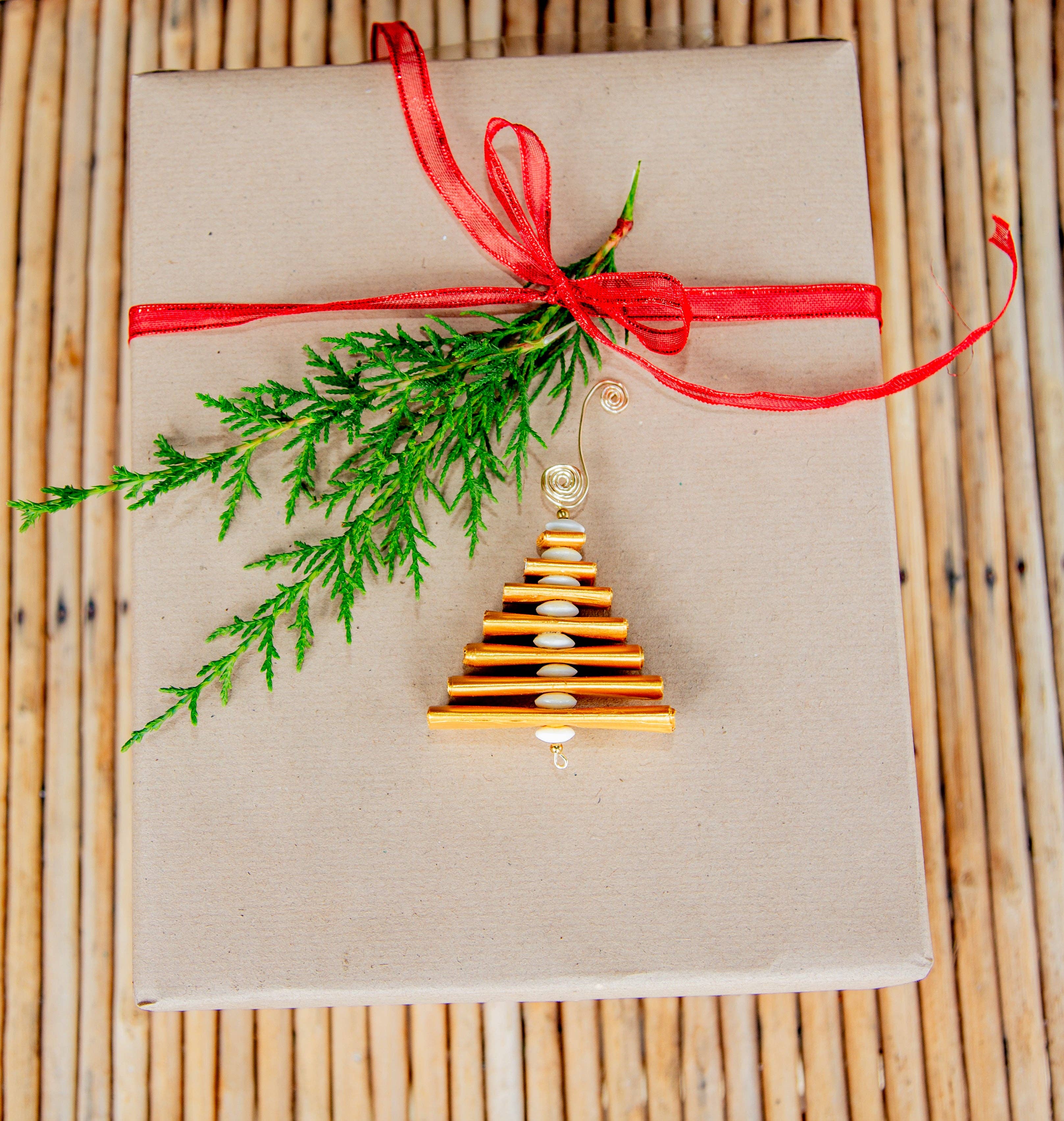 Add some festive cheer to your home this holiday season! The Sweater Christmas Tree is the perfect winter decoration. Each Sweater Christmas Tree is a labor of love by our artisans and is made from stacked pieces of upcycled sweaters found in the Kenyan market. The star topper is hand cut from brass. Each tree is roughly 8.5" tall and 4.5" wide.
