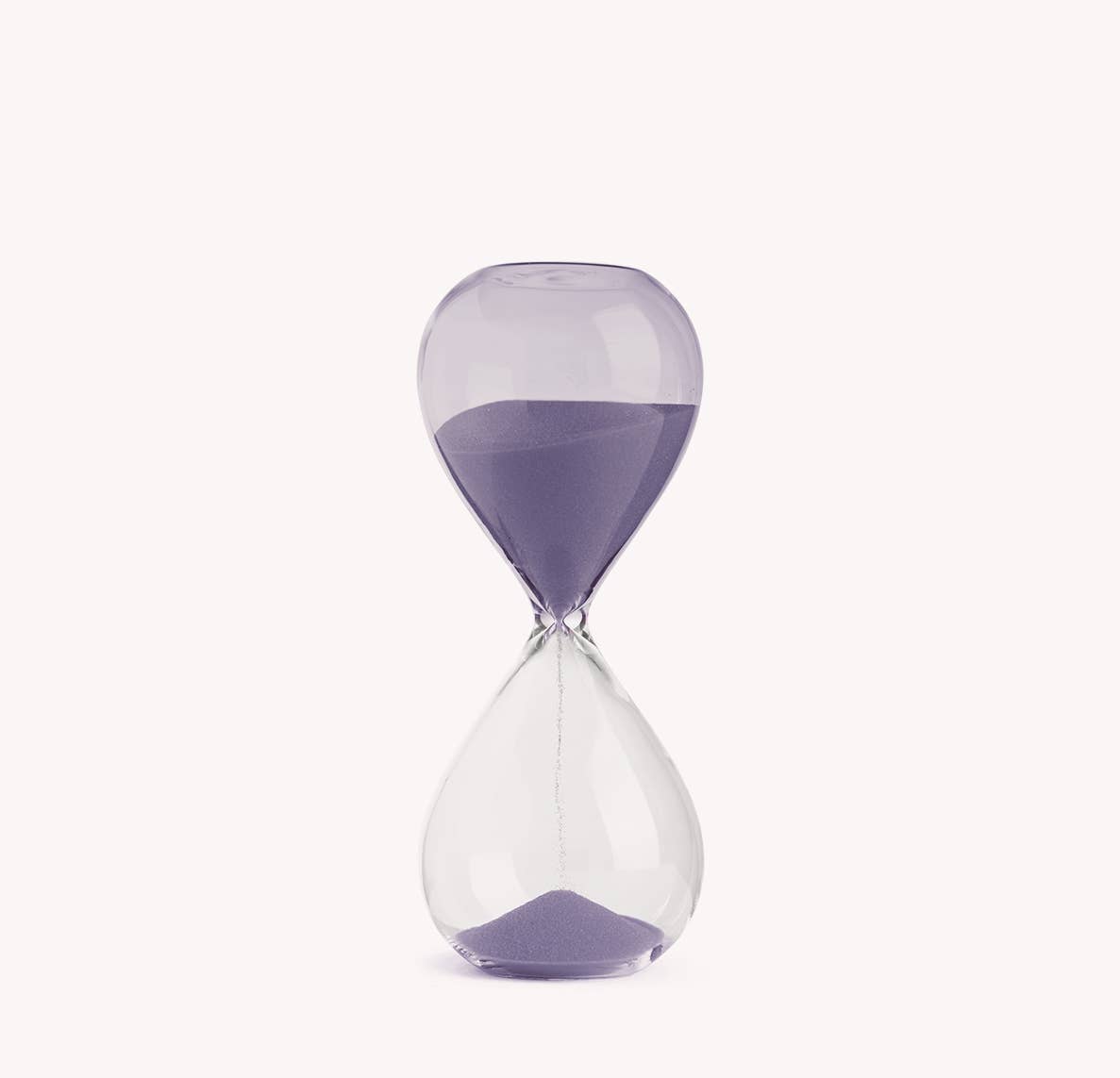 This hourglass sand timer is made of a unique crystal glass that narrows in the middle. The clear glass allows you to see the running sand. The solid marble carrera grey base makes this a total statement piece for any home or office. Attractive light blue sand runs smoothly when flipped. Once started, the sand timer competes its run in 90 minutes. This is the ultimate sand glass clock to stay on time.model # D838L-BASE. 5"D x 15 2.5lb. Handblown hourglass. 90 minute run time. Solid marble base.