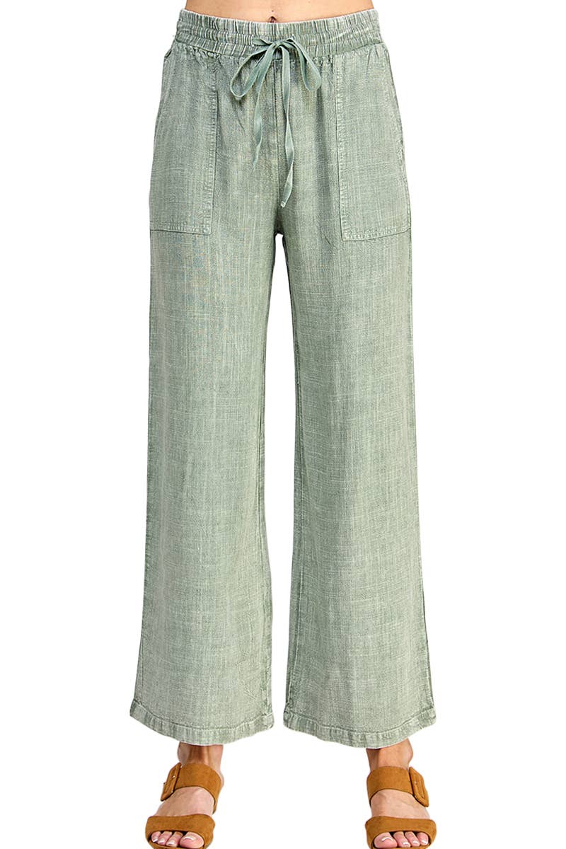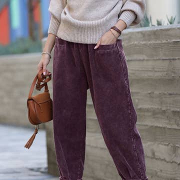 ***Image usage is allowed to the buyers who purchase from us via Faire only. 1028 Acid Wash Pants With Pockets SI-26242 - ACID WASH - DRAWSTRING BAND WAIST - POCKETS - FLARE RAW HEM **Each item is unique, expect variations in color and finishing TOTAL WAIST: 26", INSEAM: 25" approx. - MEASURED FROM SMALL Material: 100% COTTON SI-26242 Acid Wash Pants With Pockets (100% COTTON) MOCHA-167670 ASH BLACK-167671 ASH MOCHA-167673 SLEET-174768 MARLIN-174769 FUCHSIA-179636 K GREEN-179637 DEEP SKY-179638 ASH BLUE-180175 LT ROSE-182785 DK GREEN-182786 VIOLET-190628 DK OLIVE-191651 LT PLUM-191652 ASH JADE-191653