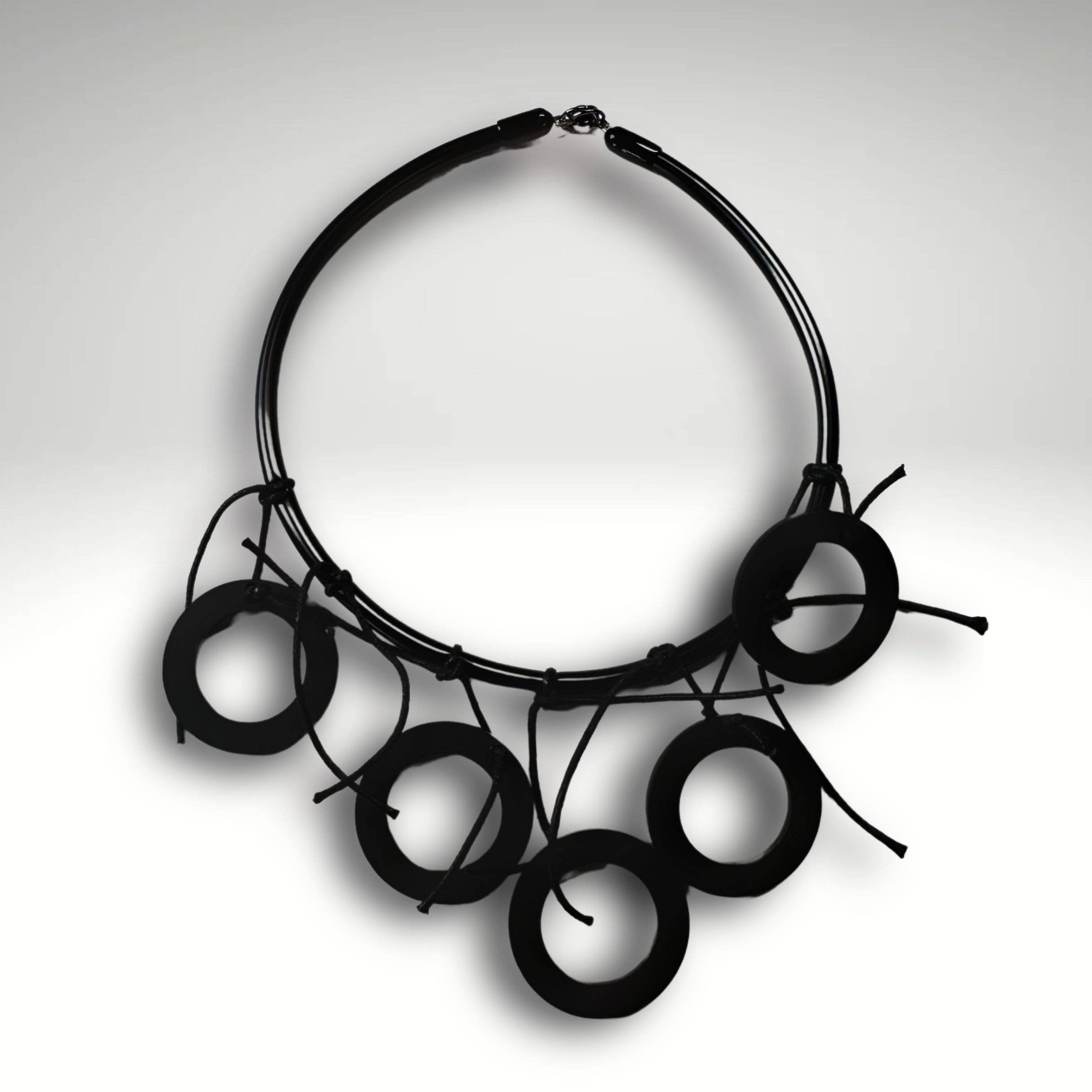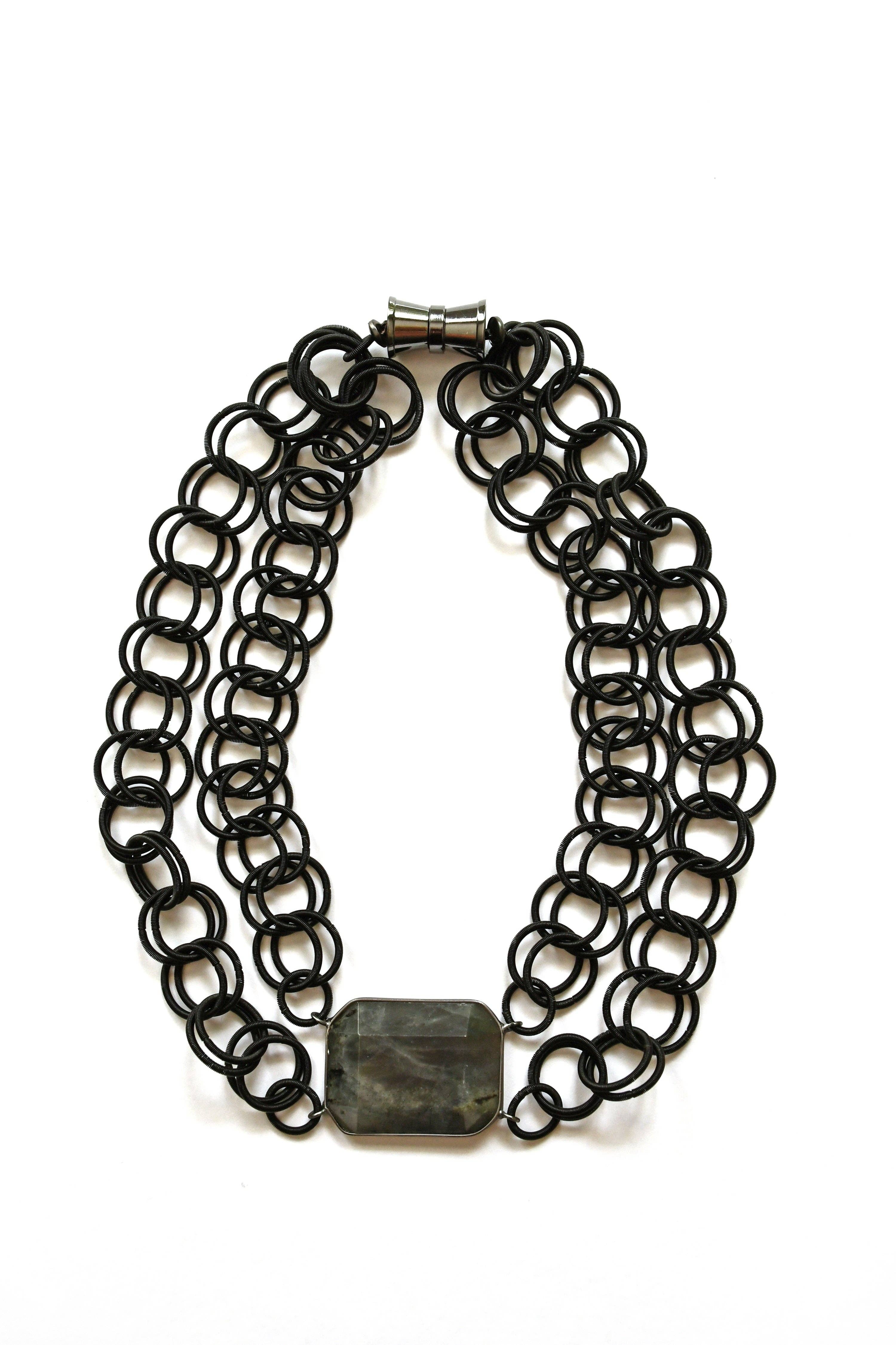 Short Black Multi Strand Necklace With Hammered Silver Swirl Pendant.