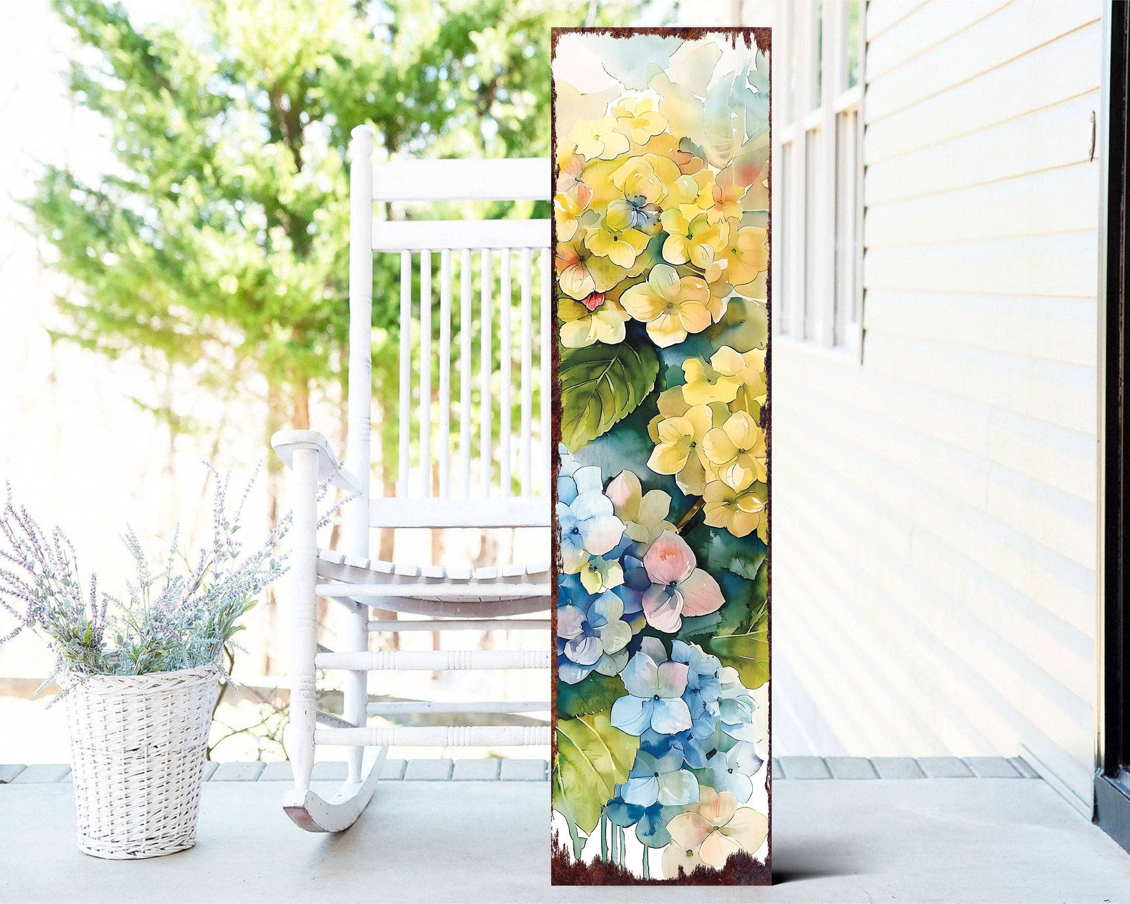 Welcome Spring with Elegant Hydrangea Decor! Infuse your home with the refreshing beauty of spring! Our stunning 36-inch blue hydrangea sign brings serene watercolor elegance to any space, making it an ideal gift or a perfect seasonal refresh for your own dwelling. Its charming floral design captures the essence of a blossoming garden, inviting warmth and tranquility. * Vibrant Blue Hydrangeas: Adds a serene, refreshing touch of nature. * UV Print & Sealed Finish: Designed for lasting color, resistant to fading. * Versatile 36in Display: Perfect for porch, entryway, living room, or mantle. * Watercolor Style Art: Unique, elegant, and complements various decor. * Effortless Seasonal Refresh: Instantly brightens your home for spring & summer. Details & Materials * Material: High-Quality Wood Composite * Finish: Fade-Resistant UV Print with Protective Sealant * Dimensions: 36" H Vertical Sign * Design: Original Watercolor Floral Art Perfect For * Front Porch & Entryway * Living Room & Mantle Decor * Spring & Summer Home Styling * Thoughtful Housewarming or Hostess Gift Legal Notice Copyright ©2022–present belongs solely to Purple Bamboo, Inc. The content herein, including but not limited to, designs, materials, all intellectual property, and the selection and placement thereof in such designs, copy, text, and photography, is the sole and exclusive right of Purple Bamboo, Inc. Any attempt to copy or reproduce any designs—by any means, electronic, manual, visual, or otherwise—is prohibited by law, and all infringements, intentional or otherwise, shall be prosecuted to the full extent of the law.