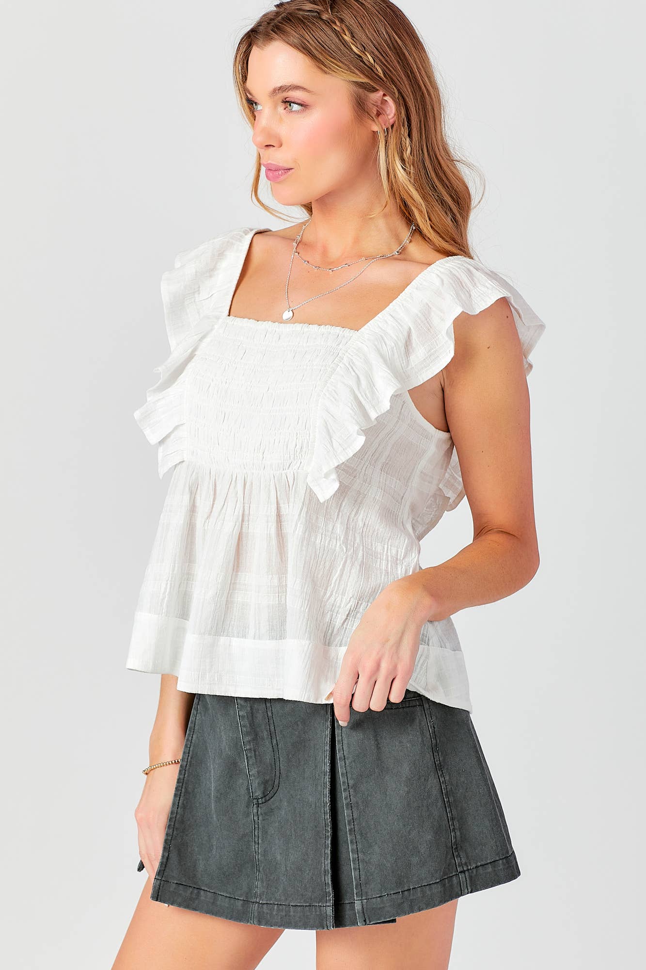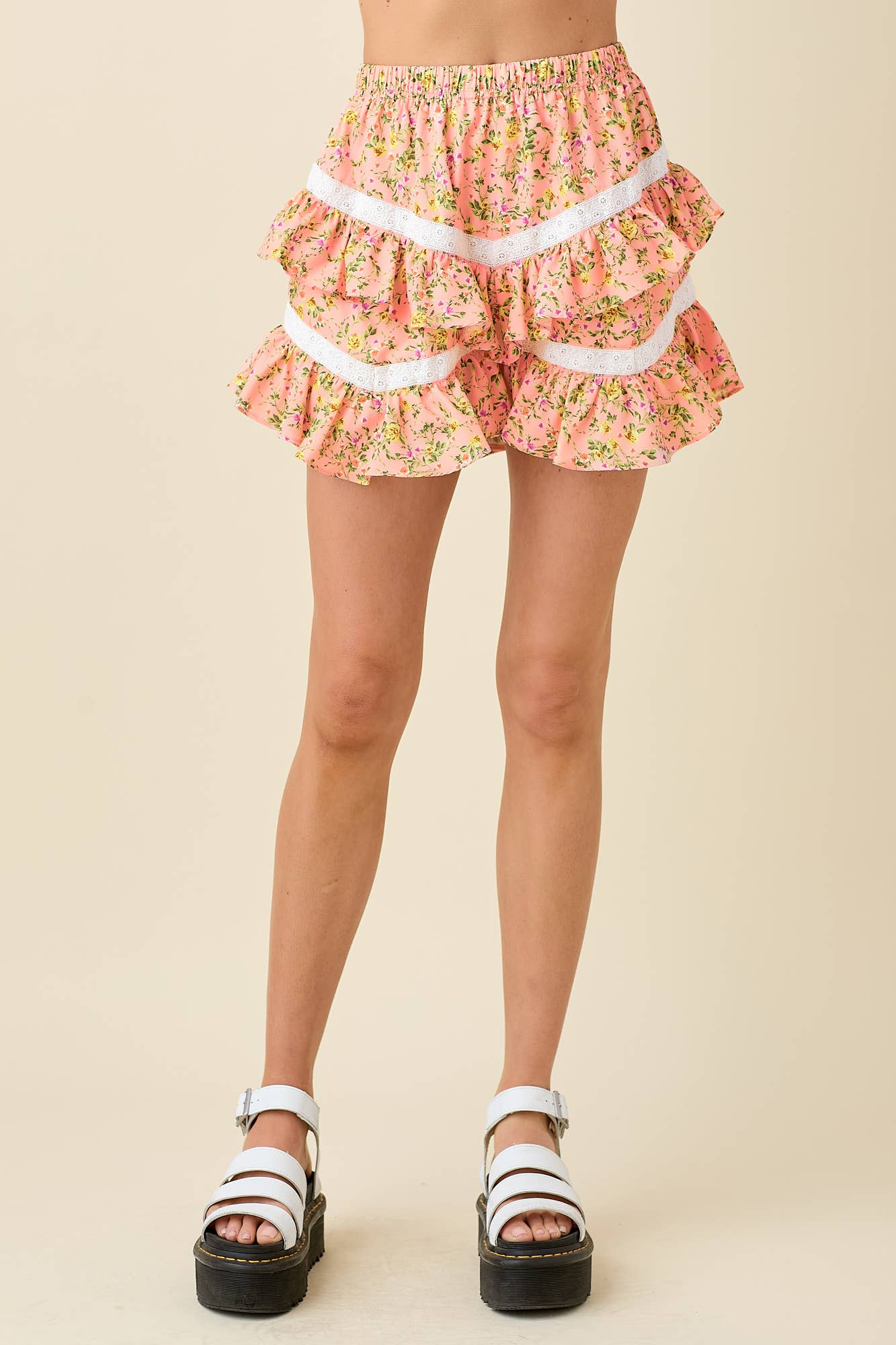 Printed contrast lace detailed corset style cropped top -Open front with eyelets -Contrast lace detail -Smocked back detail -Pin tuck detail front -Partially lined -Bottom sold separately Trending style with beautiful ditsy floral print. Comfy enough to wear with any bottoms. Wear casually with a pair of your favorite denim shorts. Stand out with our exclusive print. Lace details makes you look feminine but fun. Remade from our best selling bodies. Model Measurements Height 5'7" Bust 32" Waist 24" Hip 35" The models is wearing a size Small.