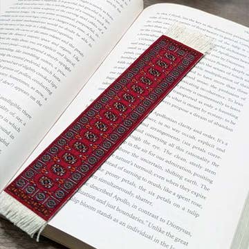 The Turkoman is among the most popular oriental rug designs in the world. It is recognized by the stylized ivory blossoms woven in an overall pattern on a luscious red field. The field is surrounded by several borders containing more stylized flowers. Fanciful myths have evolved to describe the origin of the pattern-some say they are stylized elephant feet. Most experts agree, however, that original Turkoman weavers drew their inspiration from the flowerbeds of a formal garden. Design © Arthur T. Gregorian Oriental Rugs. Made in the USA. BookRug dimensions - approximate finished size 7” × 1.25” (including fringe) and .07" thick. GMB-K UPC 680638800038 bookmark oriental rug carpet gift