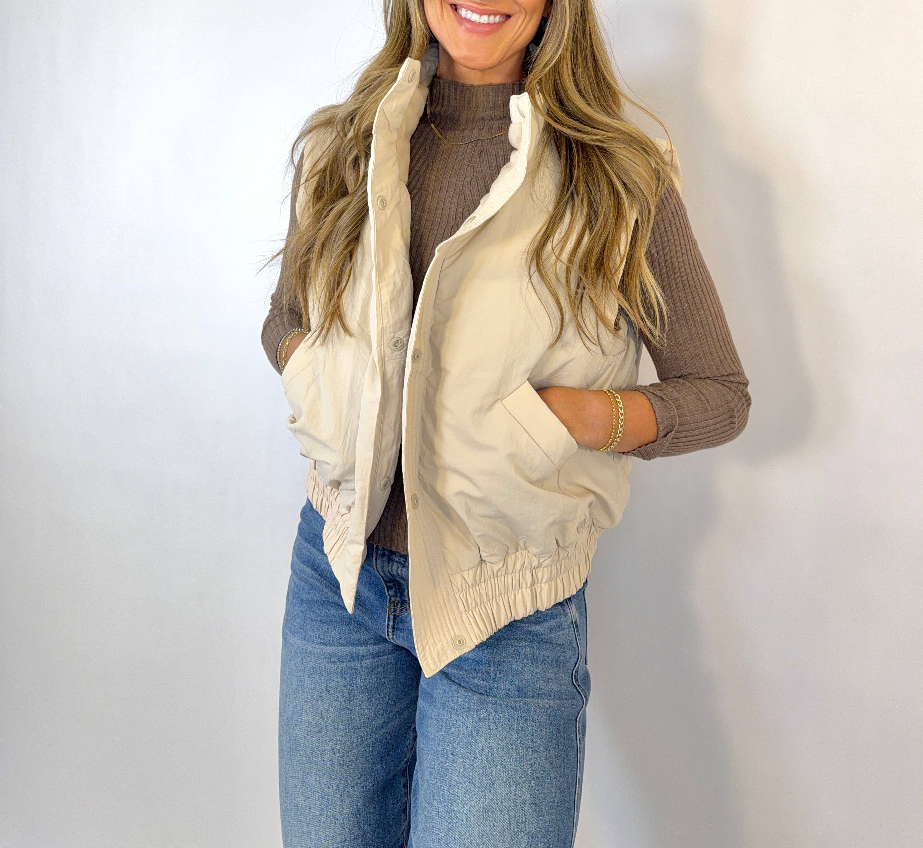 This is a chic and modern puffer vest features a sleeveless, bomber-style cut with a high, protective stand-up collar and a tonal snap-button closure. A unique, vertically quilted placket adds textural detail, while the wide, ruched elastic waistband cinches the hem for a stylish and comfortable fit. Complete with angled side pockets, this vest is a trendy and functional layering piece, perfect for adding a pop of color and warmth to any casual ensemble. -Model is 5'9" and wearing a Small