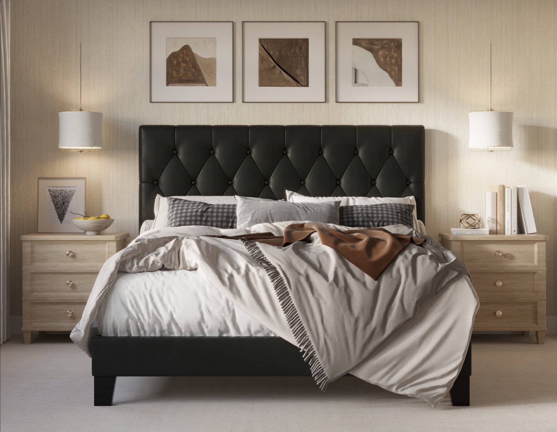 Transform your bedroom into a sophisticated haven with our Queen Size Upholstered Platform Bed Frame. This modern and elegant piece combines both style and functionality, featuring a soft fabric upholstery available in both beige and grey to seamlessly match various bedroom decors. The high, padded headboard provides ultimate comfort, perfect for reclining and relaxing while reading or watching TV. Designed with a subtle curved detail, the headboard adds an extra touch of elegance and creates a cozy, inviting atmosphere. Built-in USB ports add convenience, allowing you to easily charge your devices without needing extra outlets. Key Features: Spacious Storage Drawers: Equipped with 2 large drawers, perfect for storing extra bedding, clothes, or other essentials. Convenient USB Ports: Built-in USB ports for easy charging of your devices. Dimensions: Overall Dimensions: 62.2" W x 81.1" D x 43.3" H Drawer Dimensions: 26.4" W x 21.2" D x 5.9" H