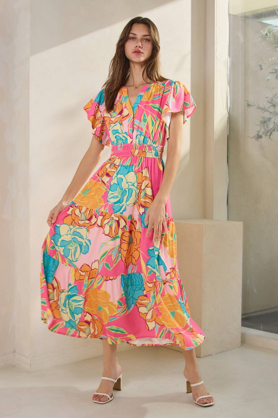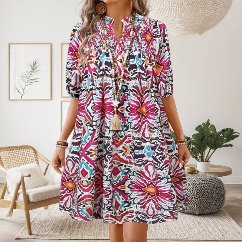 🌺Material: 100%Polyester 🌺Pattern: Floral 🌺Neckline: Collar 🌺Sleeve: Short sleeve 🌺Details: Button,Ruched BOHO Dress 📏Size Chart(INCH) | Size | Bust | Waist | Hem Width | Shoulder | Sleeve Length | Length | |-------|-Relax-|-Relax-|-----Relax-----|---Relax---|--------Relax------|---Back--| | S | 38.6 | 35.4 | 86.0 | 14.4 | 12.6 | 35.9 | | M | 40.9 | 37.8 | 91.3 | 15.0 | 12.8 | 36.6 | | L | 43.3 | 40.2 | 96.7 | 15.6 | 13.0 | 37.4 | | XL | 46.5 | 43.3 | 103.7 | 16.4 | 13.2 | 38.1 | Embrace the charm of spring with a delightful floral print Elevate your style with elegant puff sleeves Effortlessly chic with a sophisticated collared and buttoned design Easy to match with sandals, heels, boots for a chic look