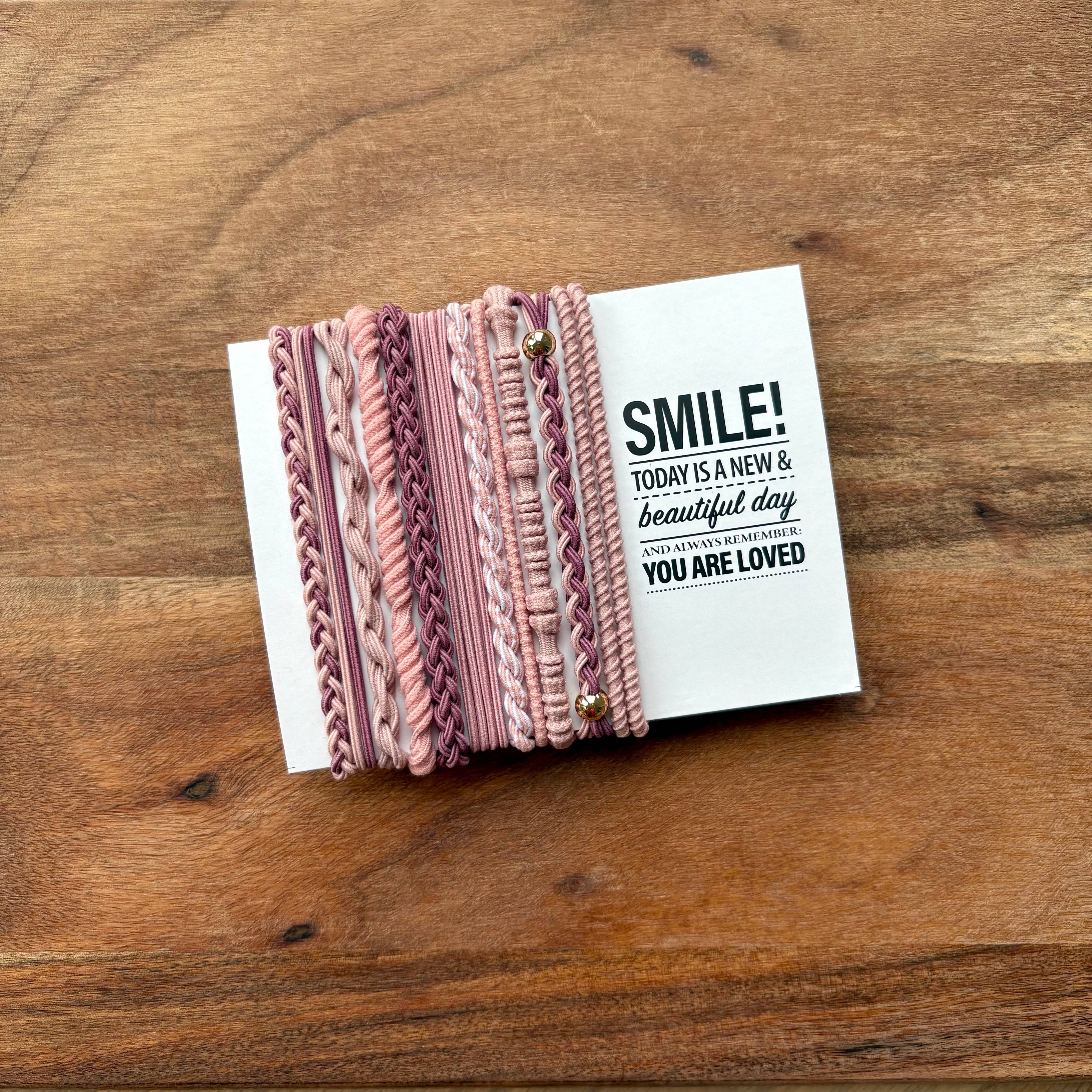 These Boho style hair ties are unique, decorative and oh so cute! Whether using your hair ties to hold up that luscious ponytail or stacking them on your wrist to add some outfit pizzazz, you can't go wrong. Hair ties come on a card complete with words of encouragement that will surely put a smile on her face! -Made of super soft nylon and elastic -8 hair ties on each card -Each card is wrapped in a crystal clear envelope