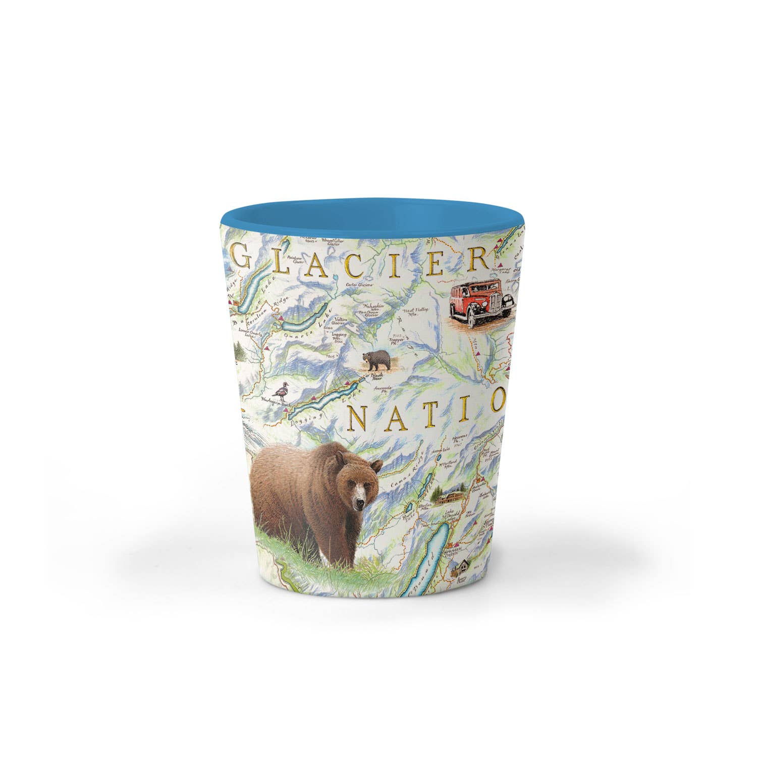 Our Set of 4 Shooters with 4 Bear Images: Surf Bear, Movie Bear, CA Bear Hug and Wine Bear. Each glass is 1.5" x 4".  Gift box measures 2.5" x 8.25" x 4.75". Imported. (MSRP $16.95) Dishwasher safe but hand wash recommended. Do Not Microwave. WARNING: This product can expose you to chemicals including lead, which are known to the State of California to cause cancer and birth defects or other reproductive harm. For more information, go to www.P65Warnings.ca.gov.