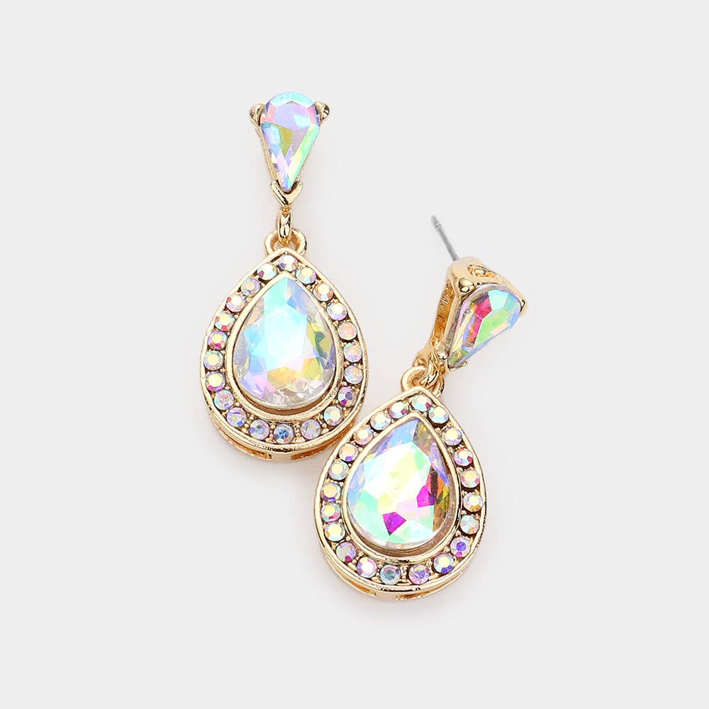 • Size : 0.75" X 1.5" • Post Back • Turn heads with these dazzling rhinestone-trimmed teardrop earrings. Featuring shimmering AB crystals framed in gold, these statement drops add instant glamour to weddings, proms, and special occasions. Lightweight and eye-catching—perfect for boutique jewelry collections.