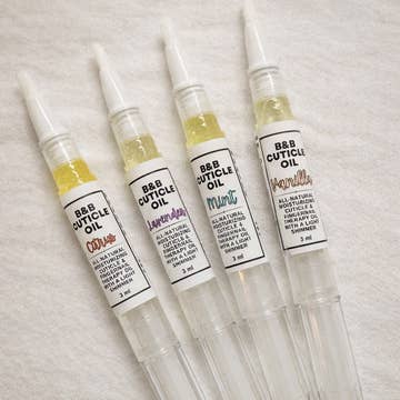 All natural cuticle oil pen, 3 mL. These beauties are a perfect blend of nourishing oils for soft cuticles. They provide intense hydration to your nails. Compact for on the go. Private Label Available! Sweet Almond Oil, Fractionated Coconut Oil, Orange Essential Oil.