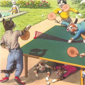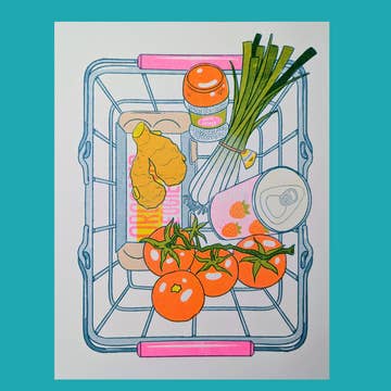 Color print on matte photo paper. Each print is packed in a plastic sleeve with a piece of 22pt chipboard for support. I hand sign each print on the back with my signature and year first released. I place a small sticker on the back with my website address and print size. Prints are borderless/cut down to the edge of the illustration. Printed, cut, and packaged at my home studio. The original drawing was made with watercolor and posca markets, cut out and collaged to found fabric. Featuring Basket Cat! In their basket. (Those are their groceries now)