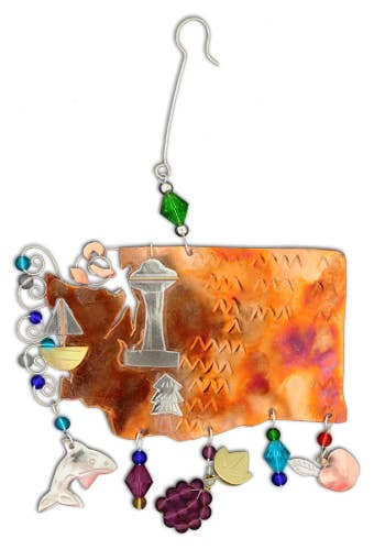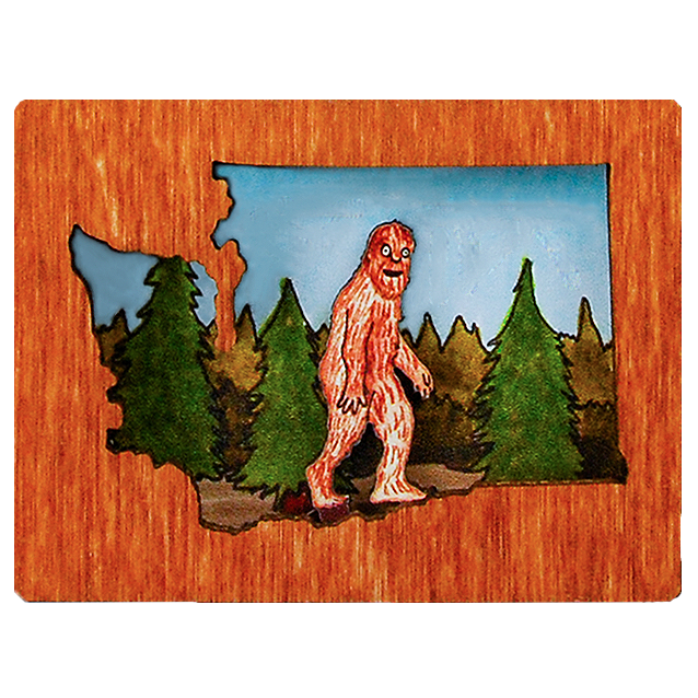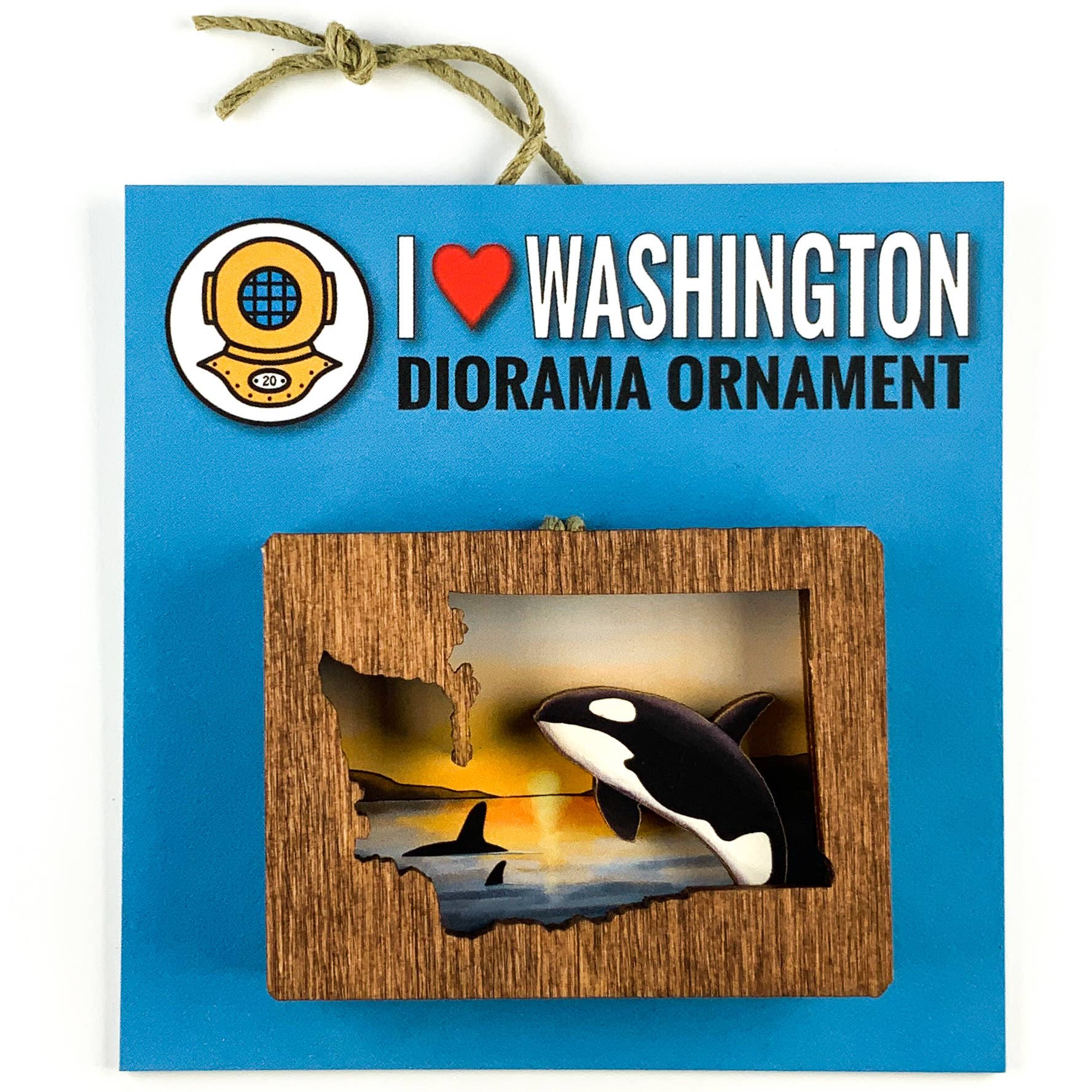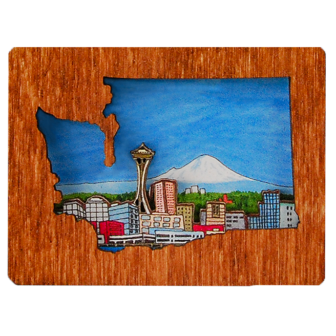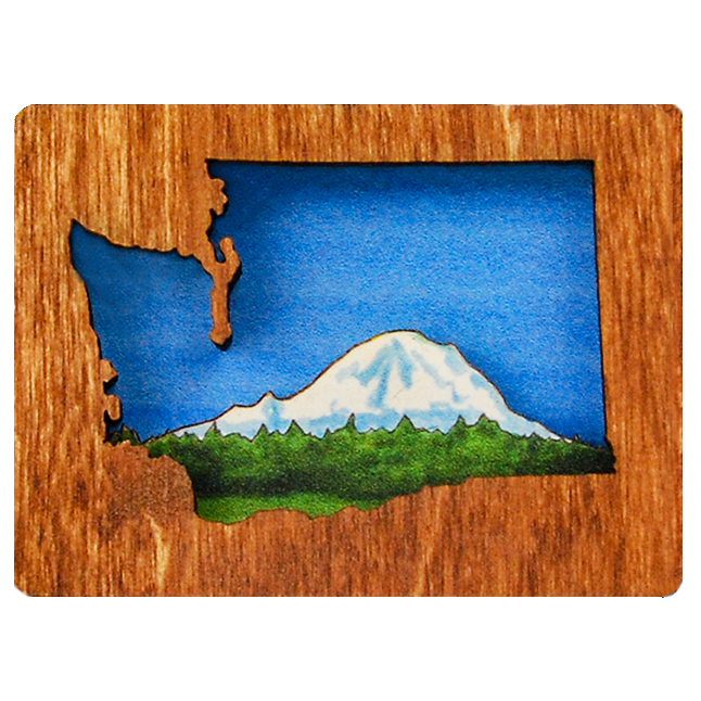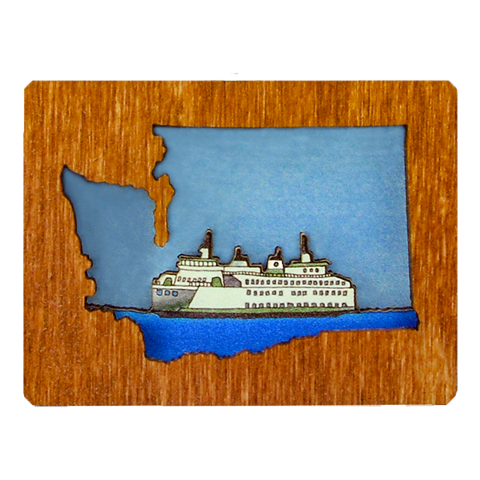 Washington diorama shows an iconic Washington State Ferry boat Available as an ornament or magnet Washington Diorama Ornaments are made from layered wood to create a three dimensional scene with incredible detail. Ornaments are mounted on an eye-catching 3" square blue card and hang with a hemp cord. Magnets are made with a strong rare earth magnet embedded in back.