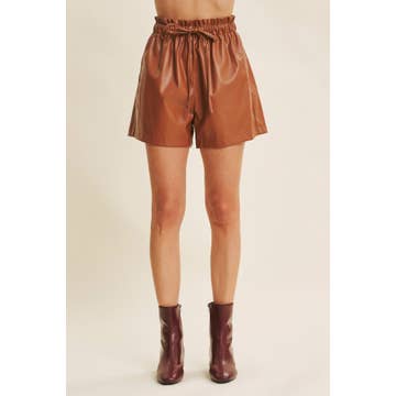 - FAUX LEATHER FABRIC - ELASTIC COVER WAIST BAND - TIE DETAIL DRAWSTRING FRONT - CURVED HEMLINE - SLANT SIDE POCKET - SHORTS STYLED WITH: H14372 AND H14361 (TOPS) MODEL IS 5'9" AND IS WEARING SIZE SMALL # spring, summer, fall, winter, shorts, leather, pleather, faux leather, drawstring, elastic waist, western