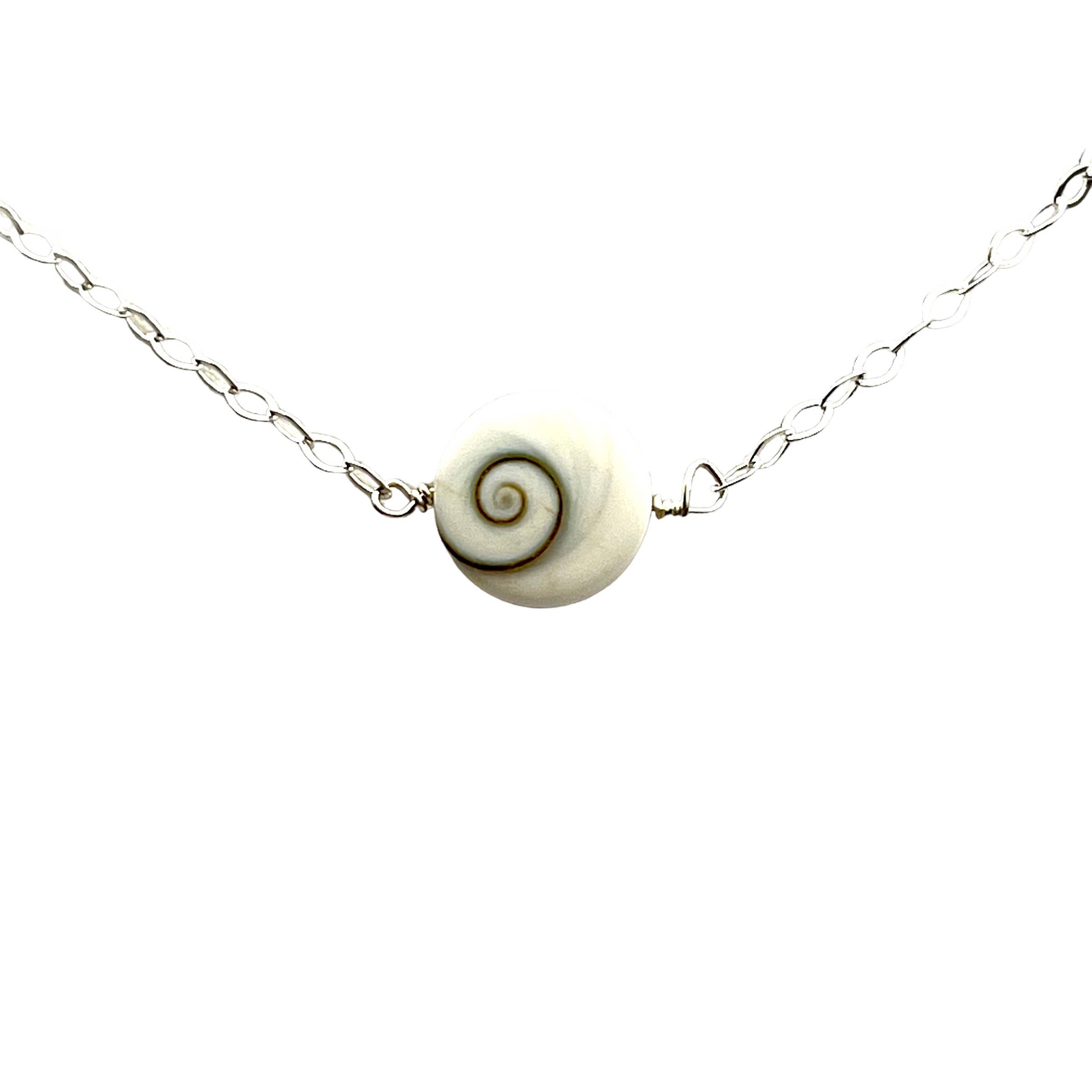 Introducing our stunning Shiva Shell Necklace, perfect for adding a touch of elegance to any outfit. This necklace features a beautiful Shiva Shell pendant that measures approximately 1.5 inches in diameter, suspended from an 18-inch sterling silver chain. The Shiva Shell is a natural seashell that has been hand-carved and polished to showcase its unique and intricate patterns. The sterling silver chain complements the natural beauty of the Shiva Shell, creating a timeless and sophisticated look. The 18-inch length is perfect for layering with other necklaces or wearing on its own as a statement piece. The Shiva Shell is said to represent transformation. Comes carded and packed in a anti tarnish bag.