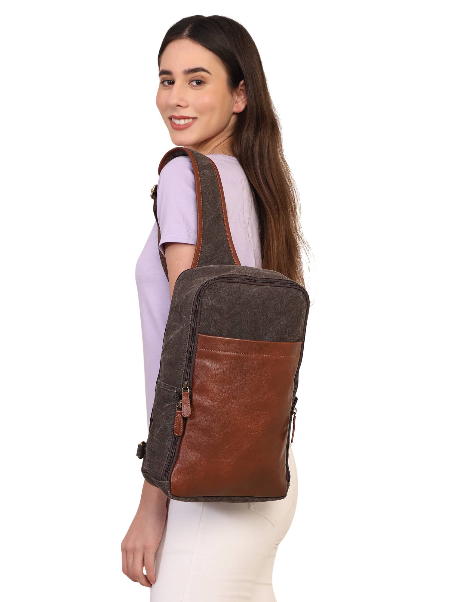This crossbody backpack is the perfect replacement for a traditional fanny pack. With the Adjustable strap, this sling bag fits all body types and can be worn over the shoulder across the chest or back. This sling bag features 3 front zipper compartments, 1 inner zipper compartment & inner padding for added safety. The canvas material makes this sling bag very durable with an added urban/sporty appeal. Ideal for outdoor sports (hiking, camping, climbing, running, cycling, etc) and travel so on. 3 Font Zipper Compartments 1 Inner Zipper Compartment Inner Padding Adjustable Strap Size: 3.5" deep x 8.5" wide x 11.5" high 80% Synthetic Leather + 20% Polyester Imported
