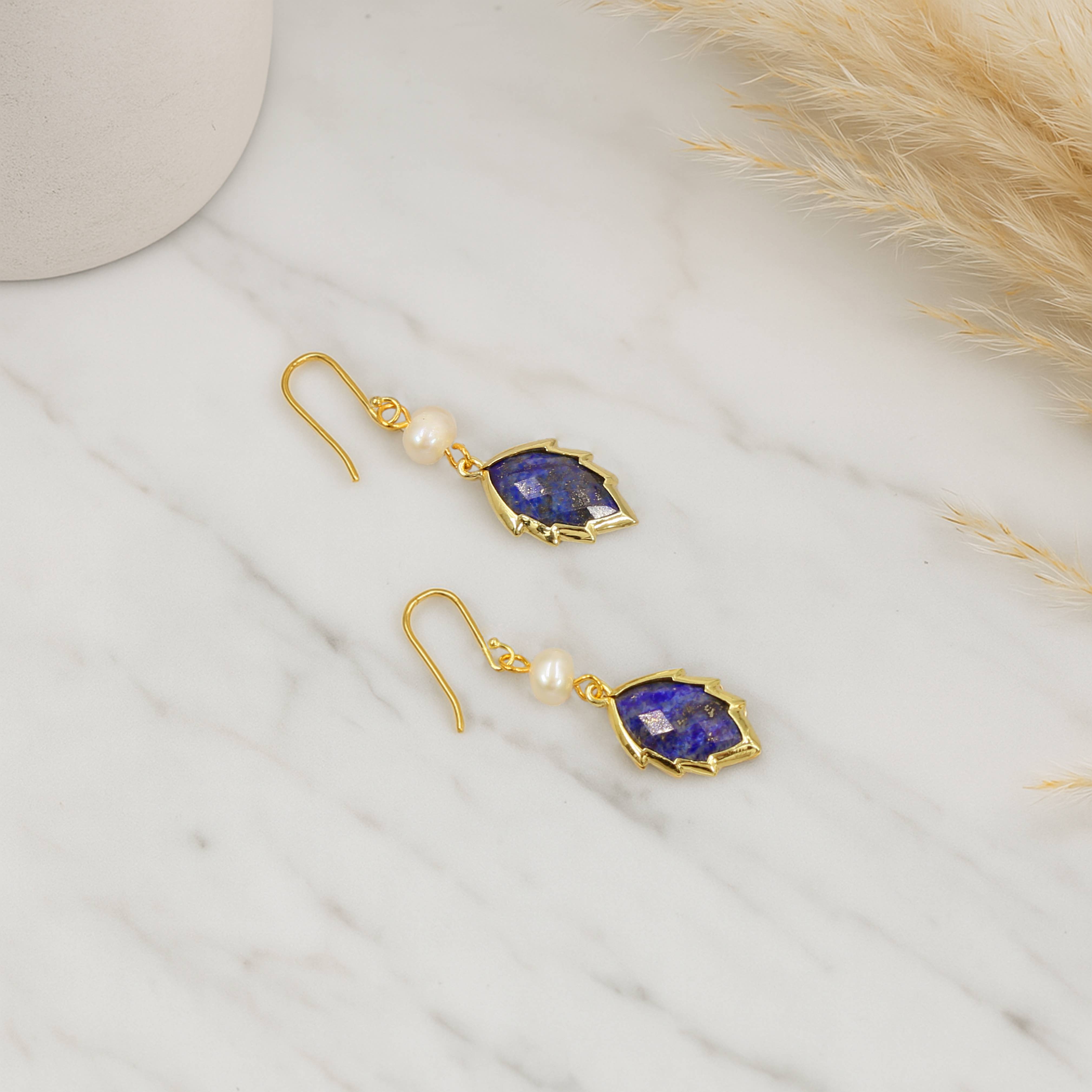 Delicate and elegant, the earrings are a harmonious blend of natural beauty and timeless design. Featuring a gold-edged faceted square-shaped Peruvian Amazonite, Amethyst, Tiger's Eyes, Rose Quartz, Strawberry Quartz, Labradorite, Red Jasper, Rock Crystal, or Aquamarine, and freshwater cultured pearl. These earrings exude soothing, feminine energy. This piece radiates love, balance, and serenity, perfect for enhancing any outfit. It is ideal for everyday wear or special occasions.