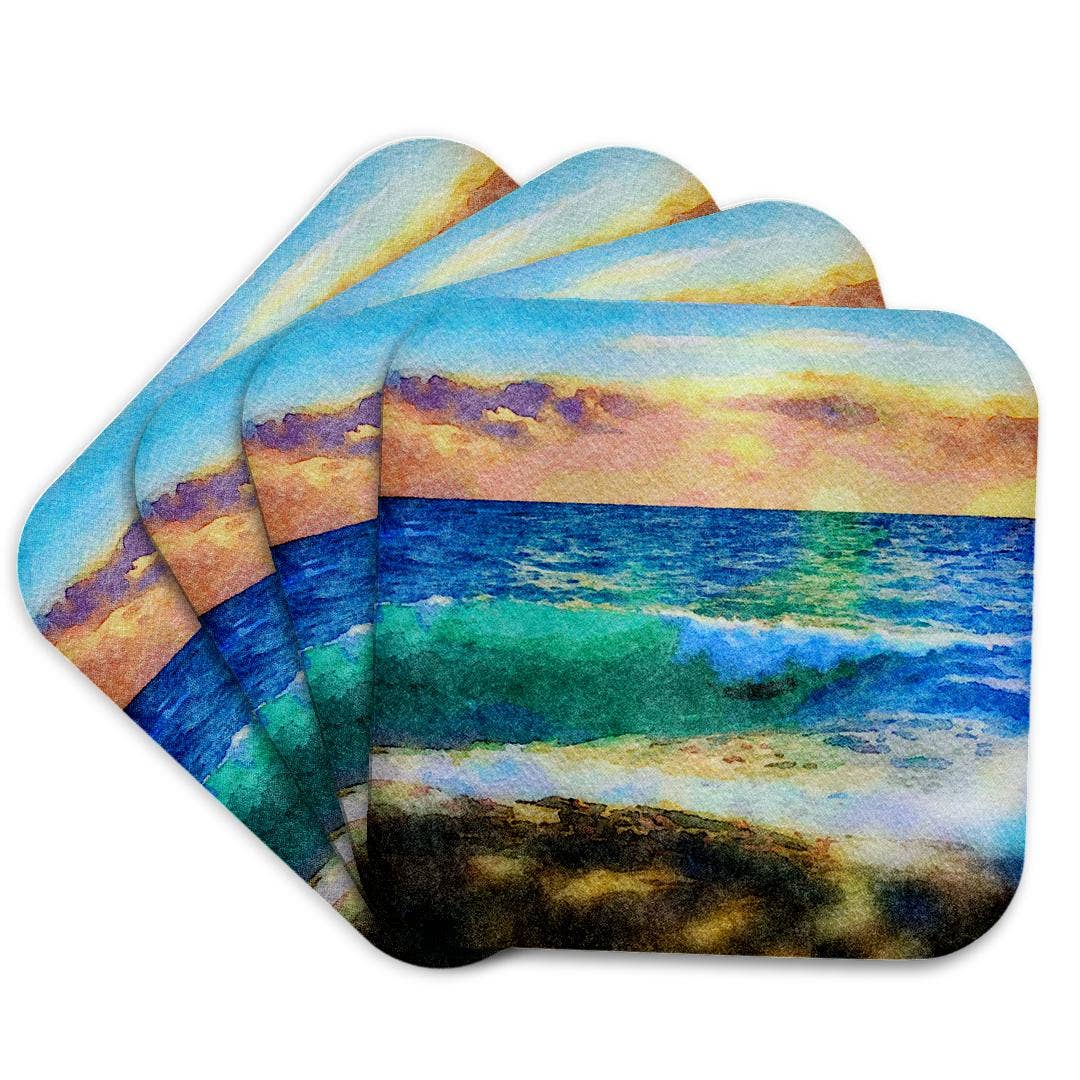 These coasters are a true work of art, as each one is individually crafted using natural beach sand and pigmented resin to recreate the beauty of a natural beach wave. Not only are they unique and one-of-a-kind, but they are also waterproof and safe to use with hot or cold items. Each coaster is finished with a cork backing to protect both the coaster and the surface it's placed on. Measuring 4" in diameter, these coasters come in a set of four and can also be used as a stunning home décor piece.