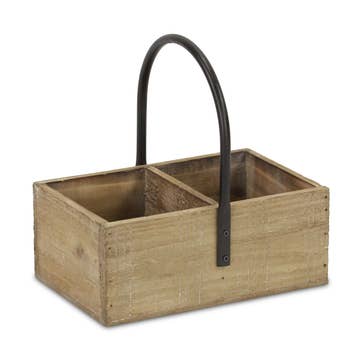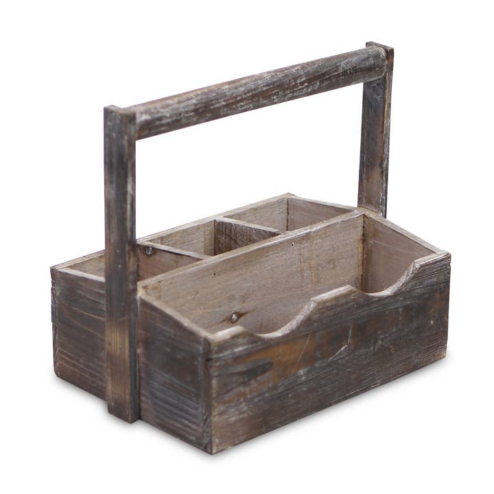 - Fully assembled and ready for use, simply unbox and display! - This piece is crafted from wood materials - Comes in a tapered design with 4 storage compartments - Includes a curved center handle - Size: L: 13.5" x W: 9.25" x H: 4" x Total H: 6" - Weight per unit: 1.7 lbs Options: - Brown: 4939 - Gray Wash: 4939GW