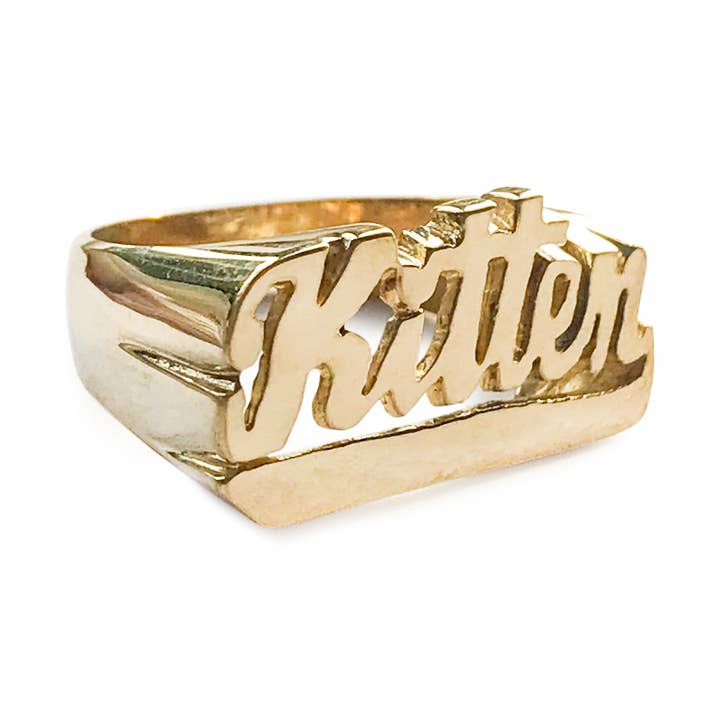 Snash Jewelry nameplate rings are available in sizes 5-9. Brass rings are uncoated, allowing for customer re-polishing. Avoiding water, heavy lotions, chlorine, etc., will prolong the original polished shine. Cleaning the ring with a jewelry polishing cloth will restore shine if tarnish occurs.