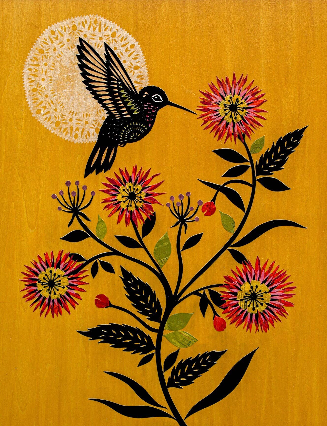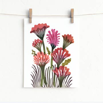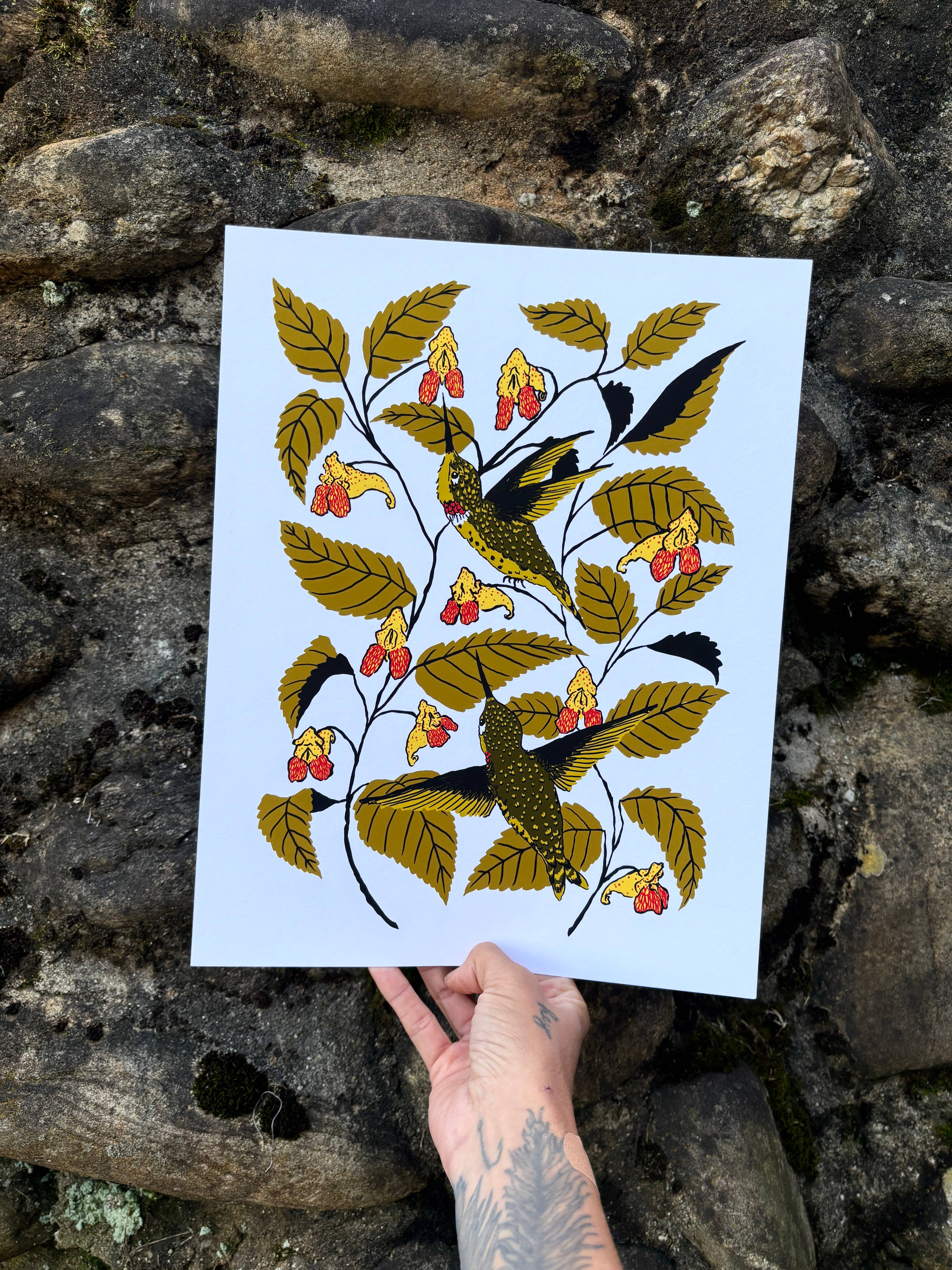 An illustration of hummingbird moths flitting around in some bee balm. This is an archival quality giclee print on white 300gsm paper. Dimensions of the paper are 14x11 inches.