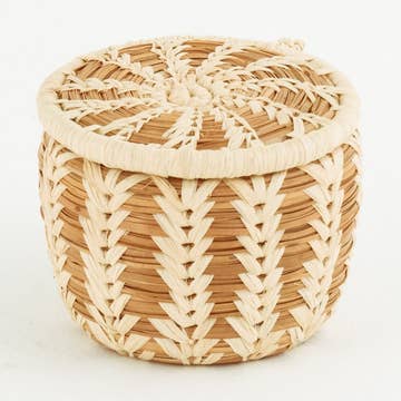 Miniature Pine Needle Basket with Lid features an intricate raffia design and is the perfect container to hold a small and special gift or to keep on your night table for your rings or earrings. Hand made and fair trade, it will bring the beauty and fragrance of pine trees into your home. Approximately 2 1/2" wide, 2" tall Pine needles and raffia