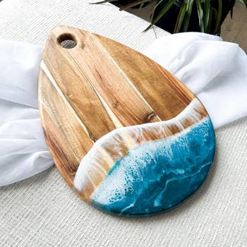 Large cheese and charcuterie board. 18" x 8". NOTE: These pictures associated with the items are for representative purposes only. A similar item will be hand-crafted in the ocean color way. Your piece will all be one of a kind. Each original is created with decorative ArtResin which is food safe nontoxic. Although the resin is scratch resistant, marks will occur if enough pressure is used. It is recommended to cut and present food on the wooden part. These can be used everyday for cutting, special events as a cheese and charcuterie board and when not in use you can use it as a piece of your kitchen decor. CARE INSTRUCTIONS: Hand wash and polish with food safe oil on board. Stainless steel tray just use light soap and water. Use oil to maintain the wood every 4-5 weeks.