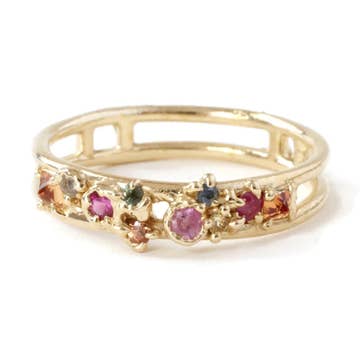 Sapphires symbolize Creativity, Strength and Clarity This ring features 5 AA Sunset colored Sapphires set in a 5mm thick .925 Sterling Silver band Size 7.5 1 of 1 This ring also features raw inclusions such as indentations made from the clay and has a more organic shape- meaning it is not perfectly round. These are completely normal things that happen during the sand casting process and makes each and every ring even more unique! ACJ hallmark is stamped on the outside of the ring.