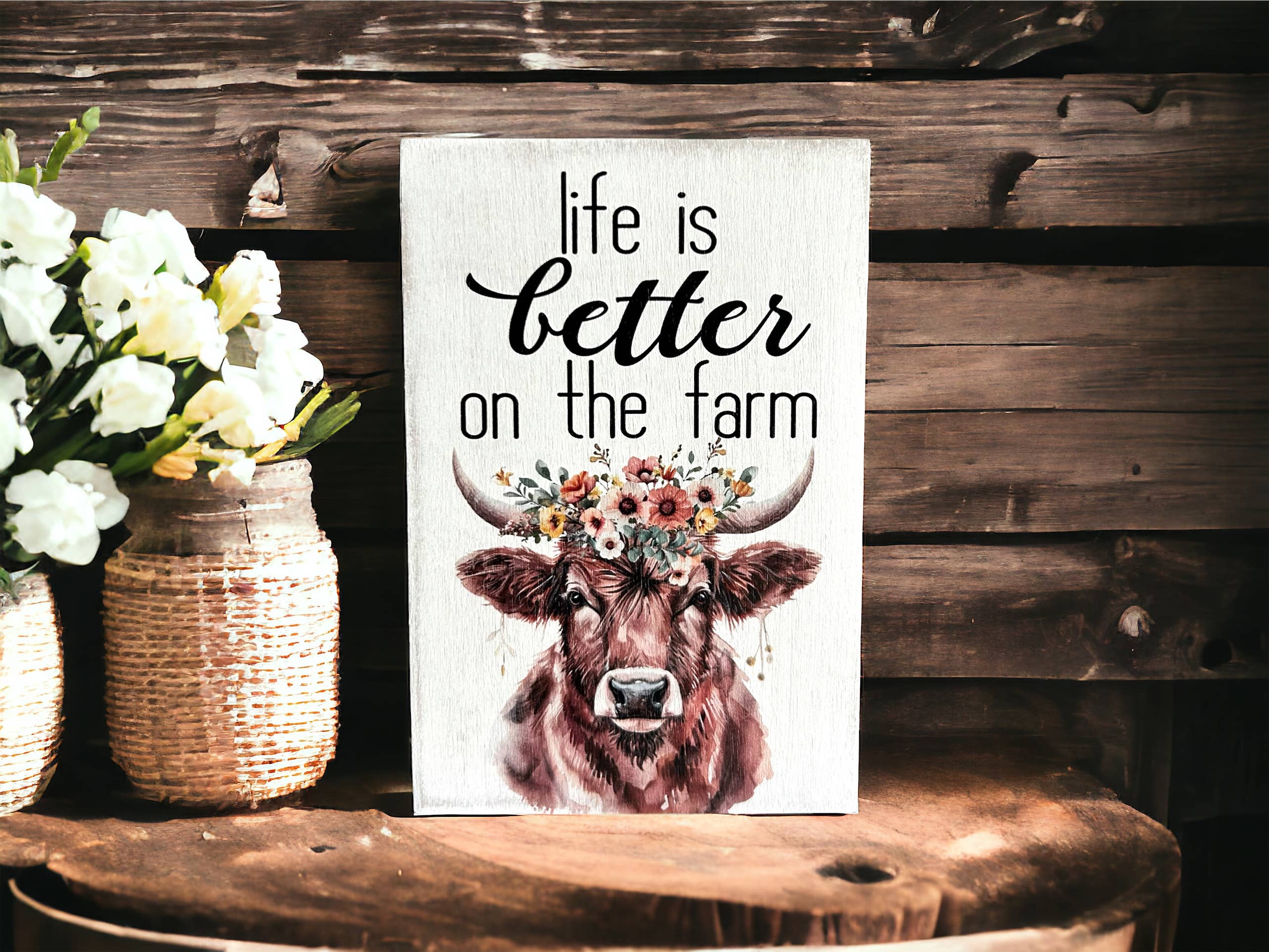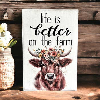 This delightful design captures the essence of whimsy and humor with three endearing dairy cows, adding a touch of lightheartedness to your space. It makes a whimsical gift for animal lovers, those with a playful sense of humor, or anyone who appreciates the simple joys of life on the farm. • Printed with high resolution archival giclee inks • Fine art cotton canvas mounted on wood • Solid hardwood frame in shown stain colors • Sustainable American oak or alder wood • Made in the USA in our Utah studio • MINI 6" tall x 6" wide x 1.25" deep w/ 1/4" thick frame • SMALL 11" tall x 11" wide x 1.25" deep w/ 1/4" thick frame • MEDIUM 15" tall x 15" wide x 1.5" deep w/ 3/4" thick frame • LARGE 20" tall x 20" wide x 1.5" deep w/ 3/4" thick frame • Signs may have +/-1" variations • All signs can stand on a shelf or table (Medium & Large can also hang on a wall) • Farmhouse style frames have small rustic imperfections that make them unique