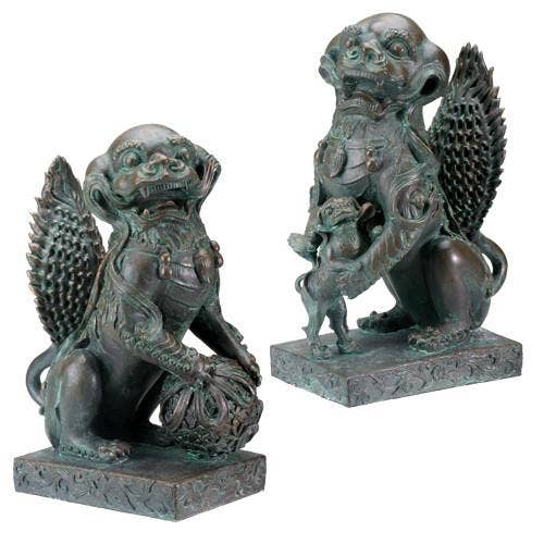 Foo translates from one of two Chinese words for "Buddha" or "prosperity". They come in pairs to represent the yin and yang of life, the feminine and masculine. The male sits to the right with his paw on a sphere to represent the earth and serves to protect the house and structure. The female sits to the left with her paw on a cub to represent the cycle of life and serves to protect the occupants and promote abundance. They are actually Imperial Guardian Lions that typically sit at the entrance of a prominent and affluent home. Foo dog statue with left paw on ball. This beautiful stone statue can be your imperial guardian. There is a lovely ancient aura. Made from clay fibre. Ideal for indoor and outdoor display.