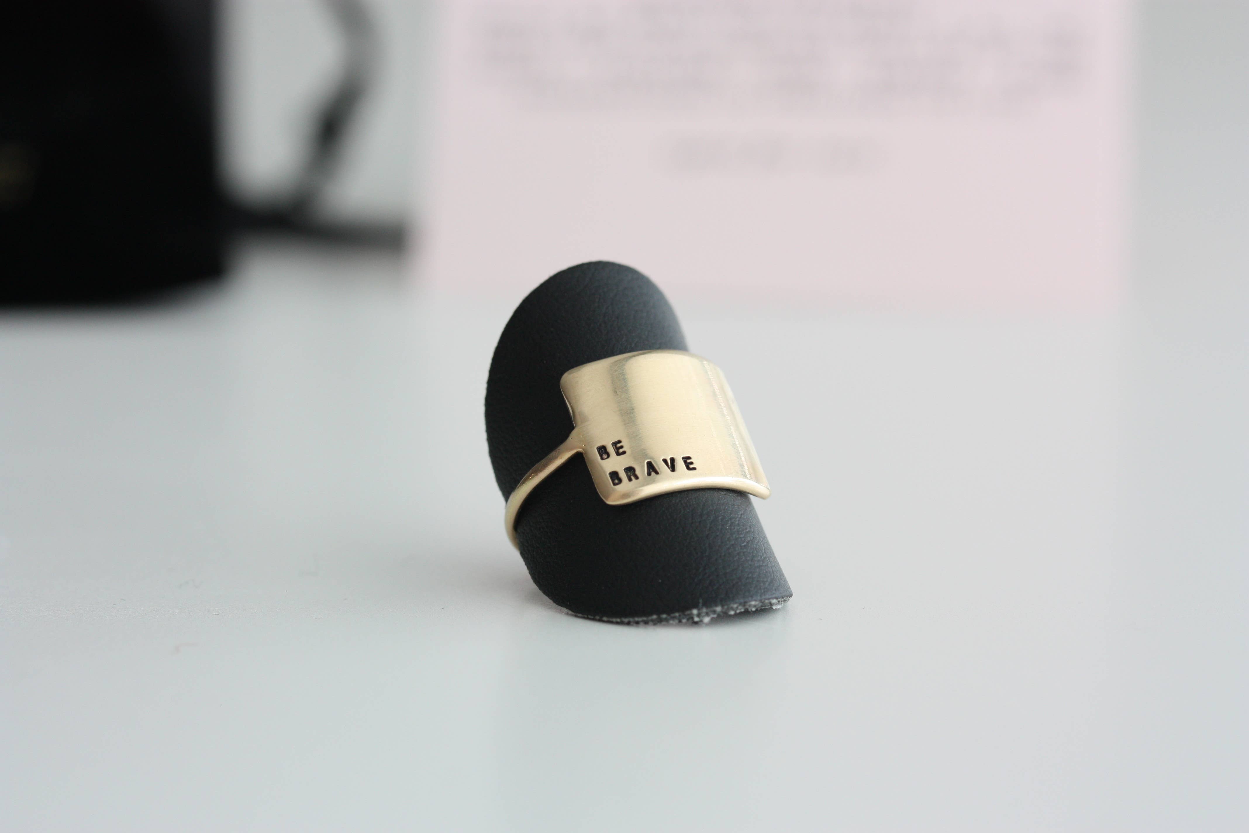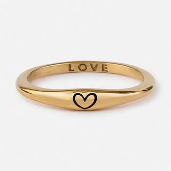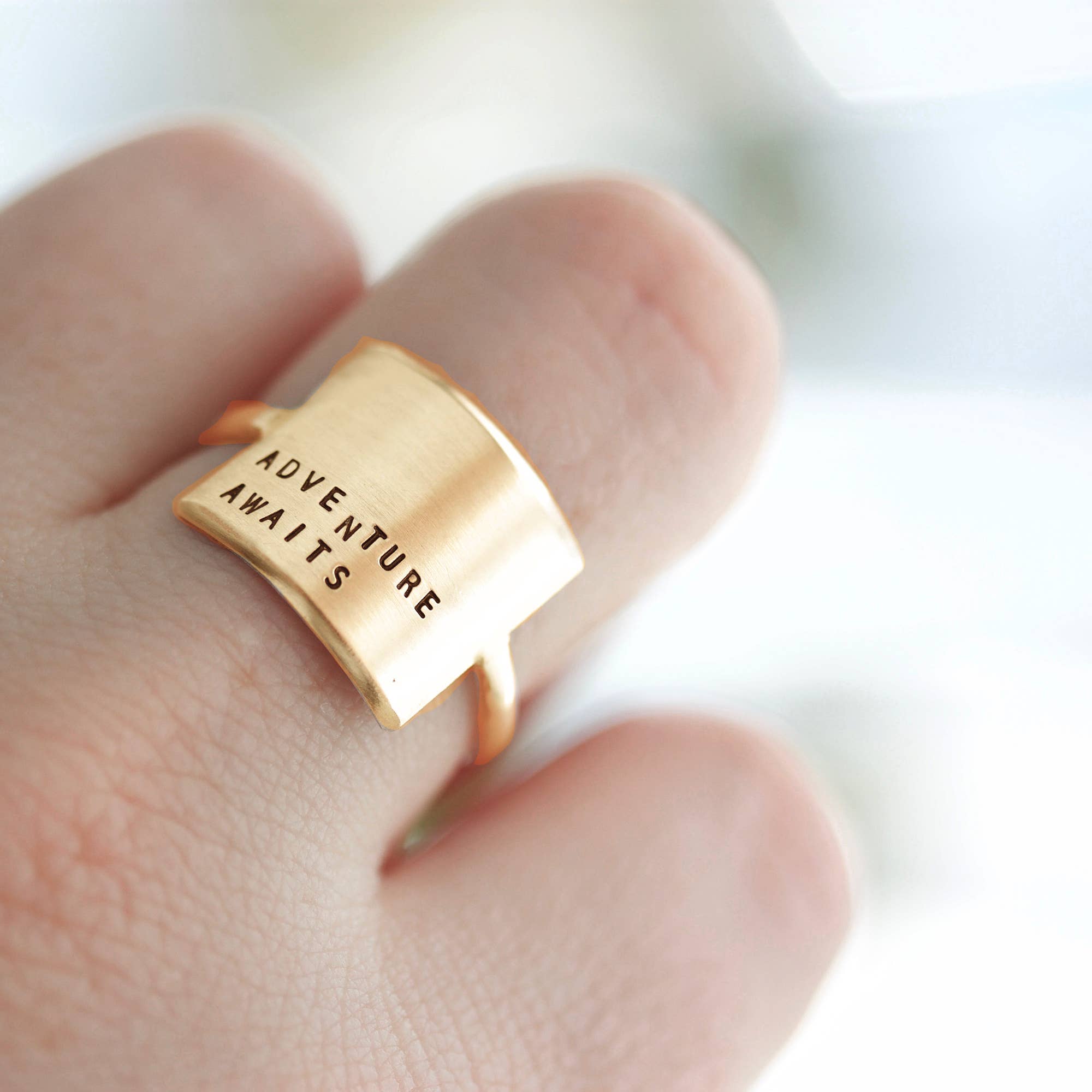 Because everyone needs a little reminder. One of our all-time bestsellers, the Wide Ring makes a statement but is still delicate. Letters are individually stamped by hand, making each ring one of a kind. The message is left justified in our signature teeny-tiny upper case block font. message plate measures 5/8" wide x 1/2" tall available in ring sizes 4 - 10.5 (half & whole sizes) handmade with love in our Georgia studio SOLID STERLING SILVER 14K GOLD PLATED GOLD-FILLED SOLID 14K YELLOW GOLD all CDK jewelry is nickel free PERSONALIZATION : 5 lines of 12 characters maximum (including spaces). Only teeny-tiny upper case block font available. Only uppercase letters, numbers and limited punctuation listed here are available: ABCDEFGHIJKLMNOPQRSTUVWXYZ1234567890!%&()_-=`\;'|:",.?/+#~♡ select CUSTOM when personalizing your message