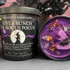 Our 100% Soy Wax Candles in our SPECIAL EDITION HOCUS POCUS CANDLE! Each candle comes with a hand-poured soy wax witch hat, purple tumbled crystals, and eco-friendly bio-degradable glitter. Each candle comes with a black lid. Our Just a Bunch of Hocus Pocus candle features notes of: Dark plum, black cherry, and citrus combined with enchanting notes of amber, sugar, musk, clary sage, freesia, and vanilla. A deep, enchanting scent to release your inner witch! All of our candles are made with ingredients that are FREE FROM carcinogens, reproductive toxins, and other potentially hazardous chemicals often found in other fragrances. They are ALL phthalate-free and made with 100% soy wax and therapeutic grade oils (NOT fragrance oils that can cause headaches!). They are also made with a cotton and paper-wrapped wick for a much slower, longer burn. This jar burns for about 50-55 hours.
