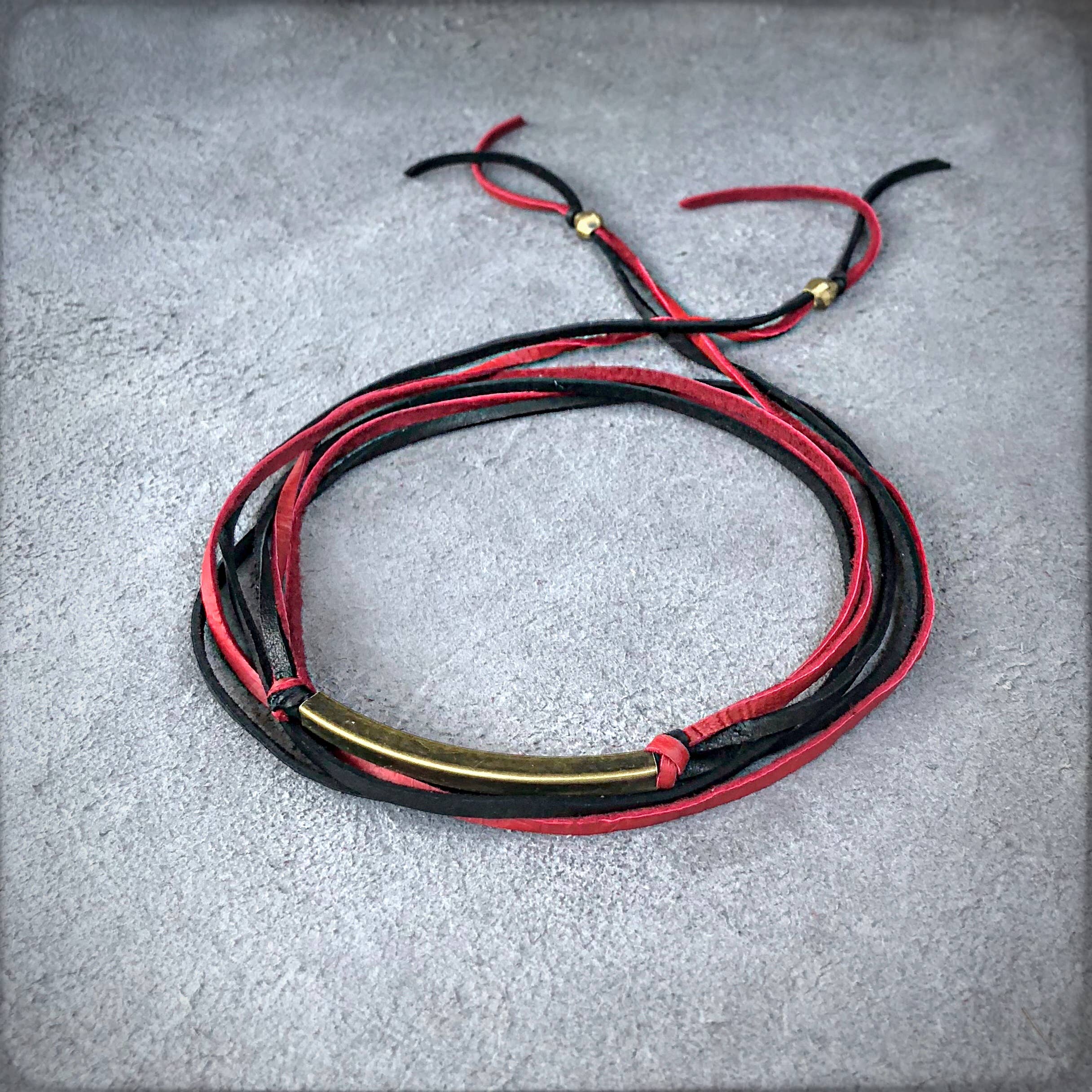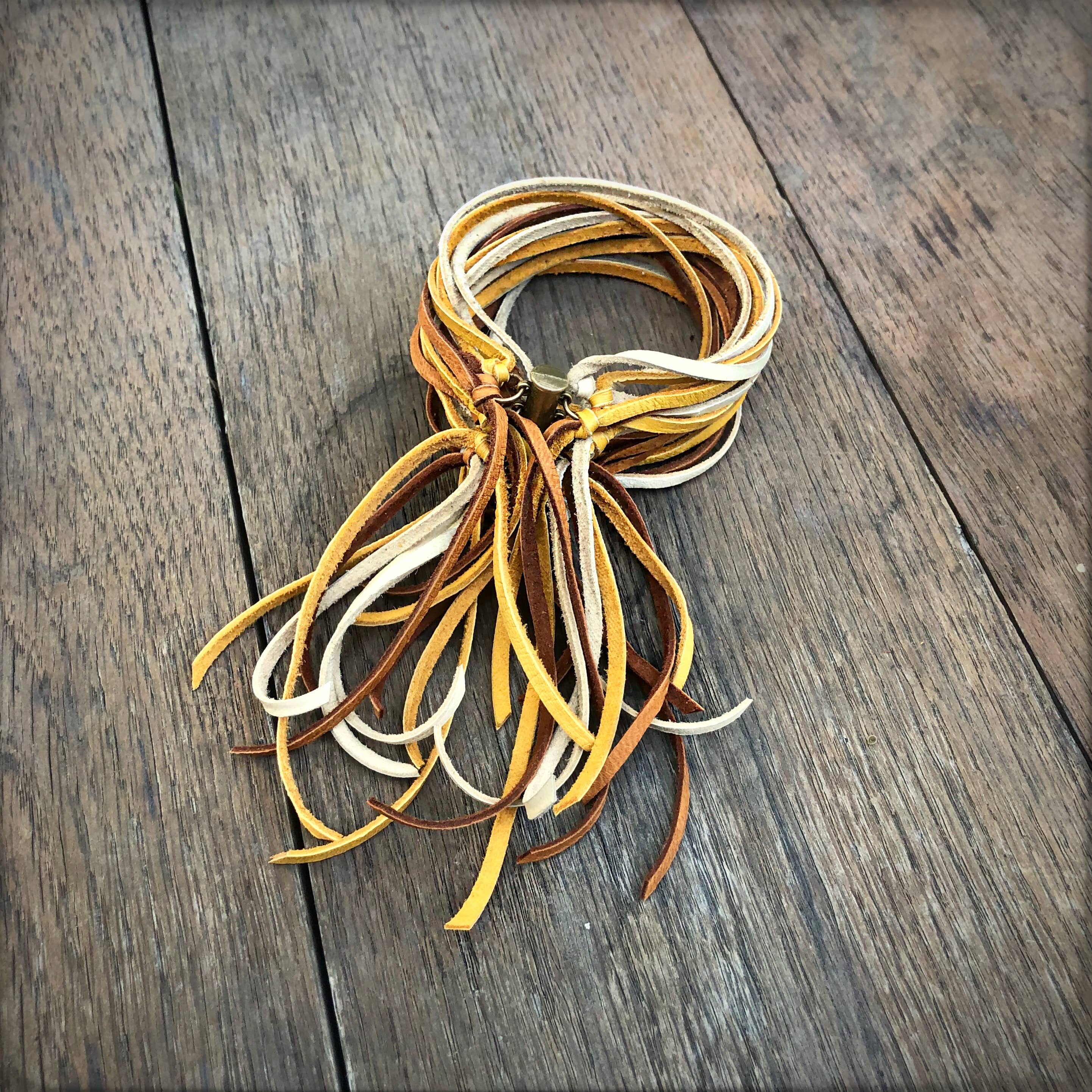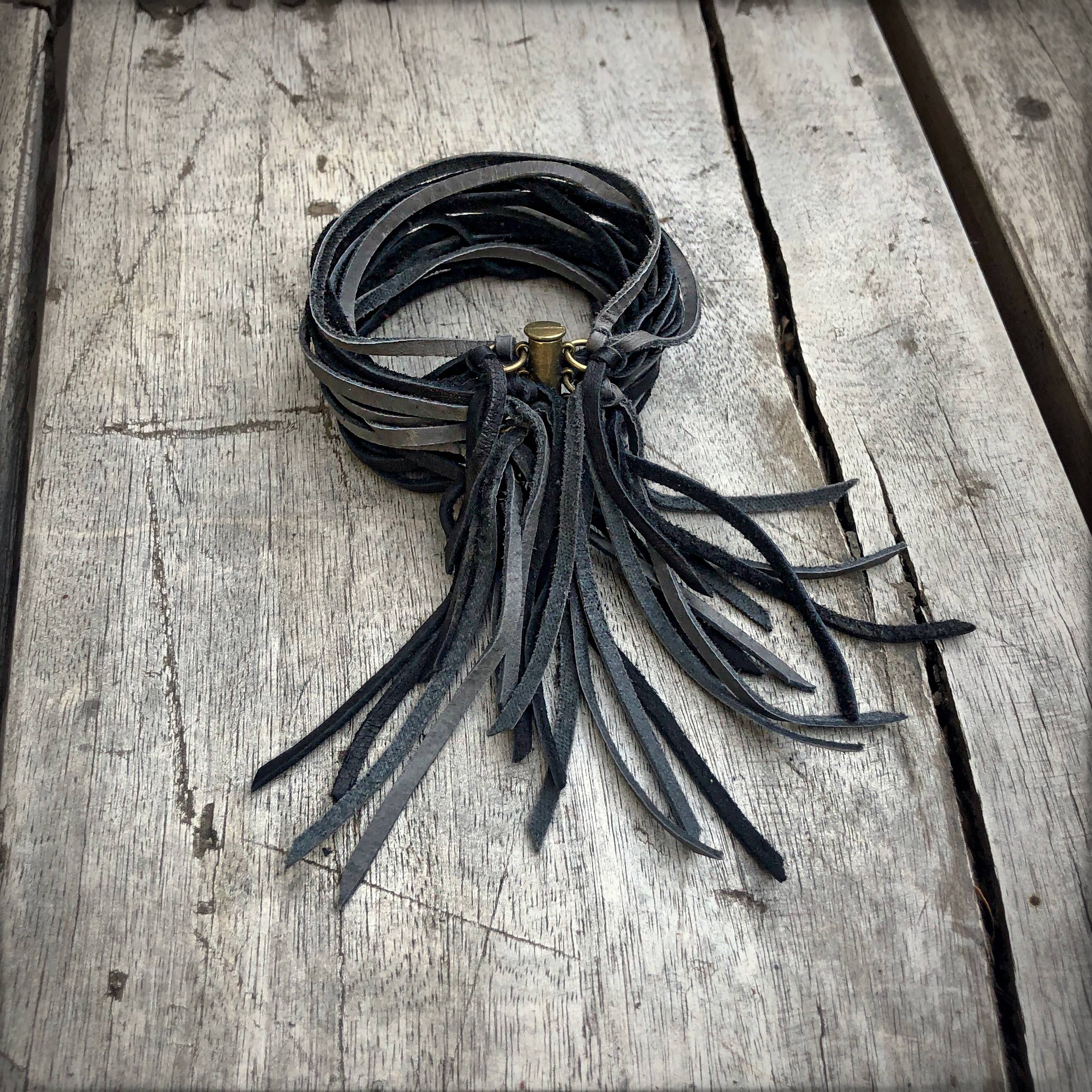 A personal favorite of the designer, this badass cuff is so soft and comfortable, you won't want to take it off. 20 strands of cadet blue deerskin leather wrap around to an antique-brass magnetic sliding clasp.