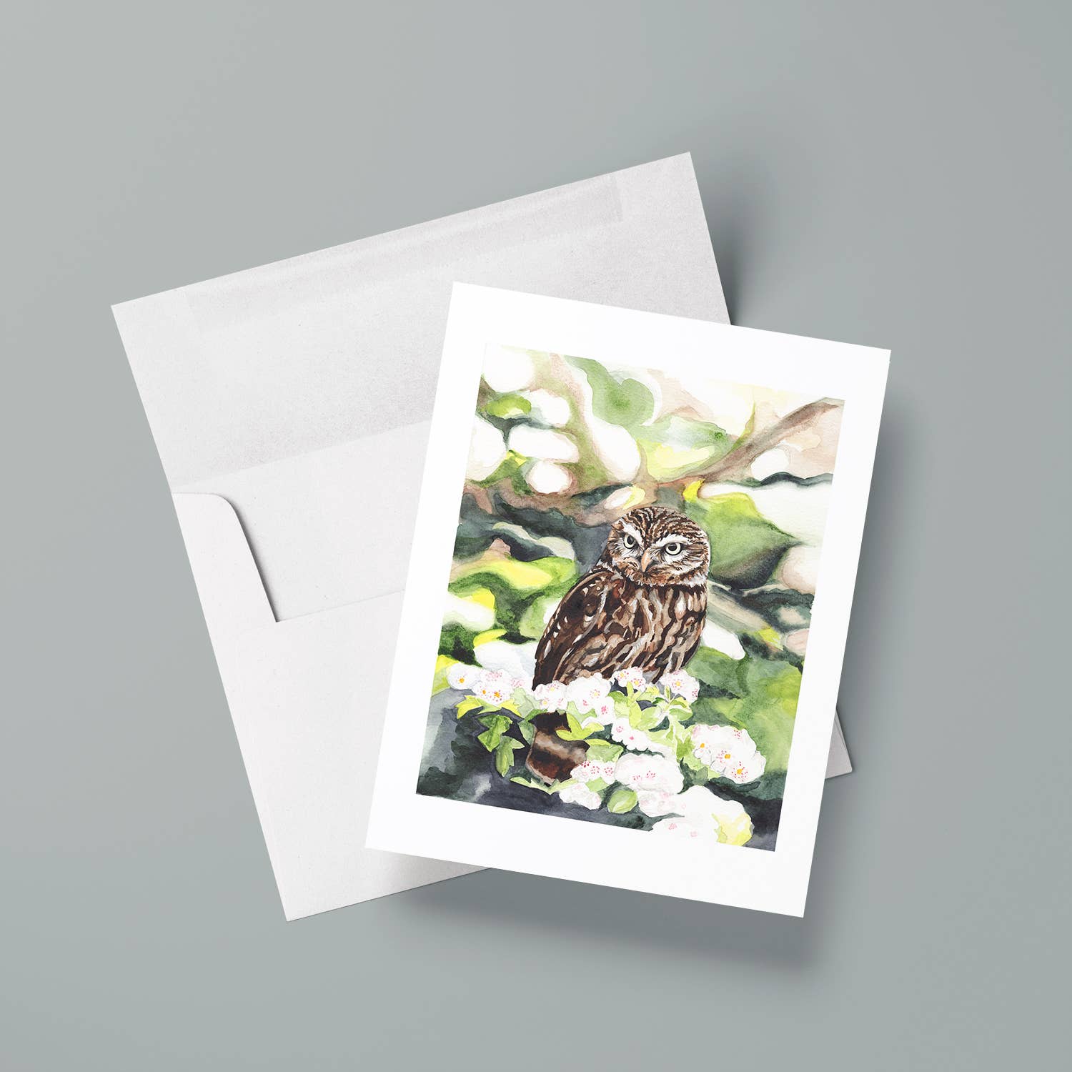 5 3/8" x 4 1/4" note card, printed on cardstock with size A2 envelope. Packaged in cellaphane sleeve.
