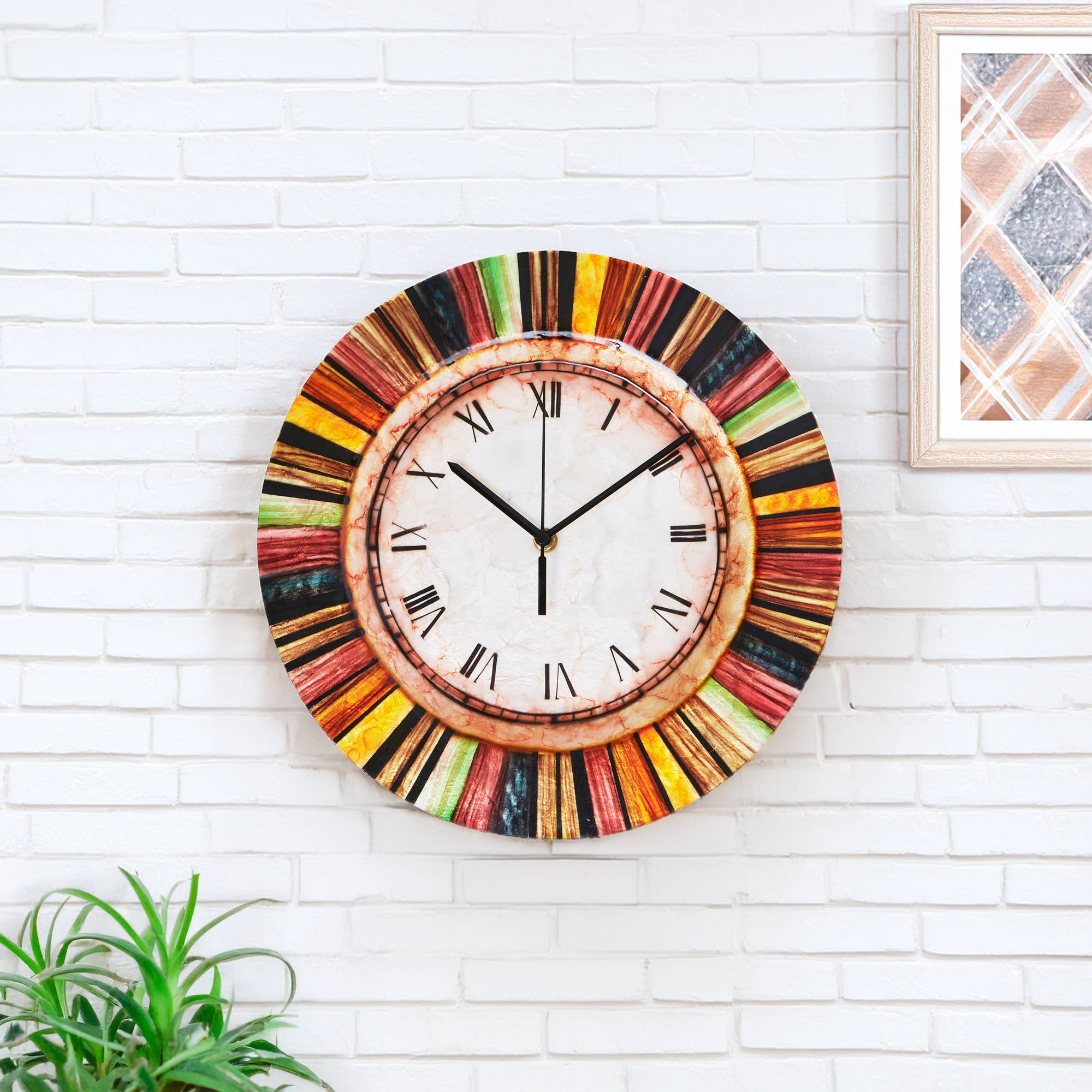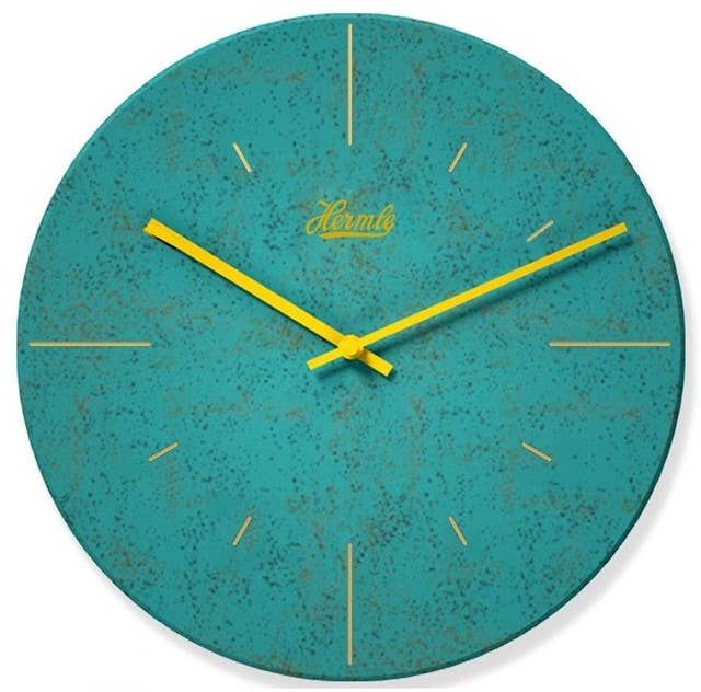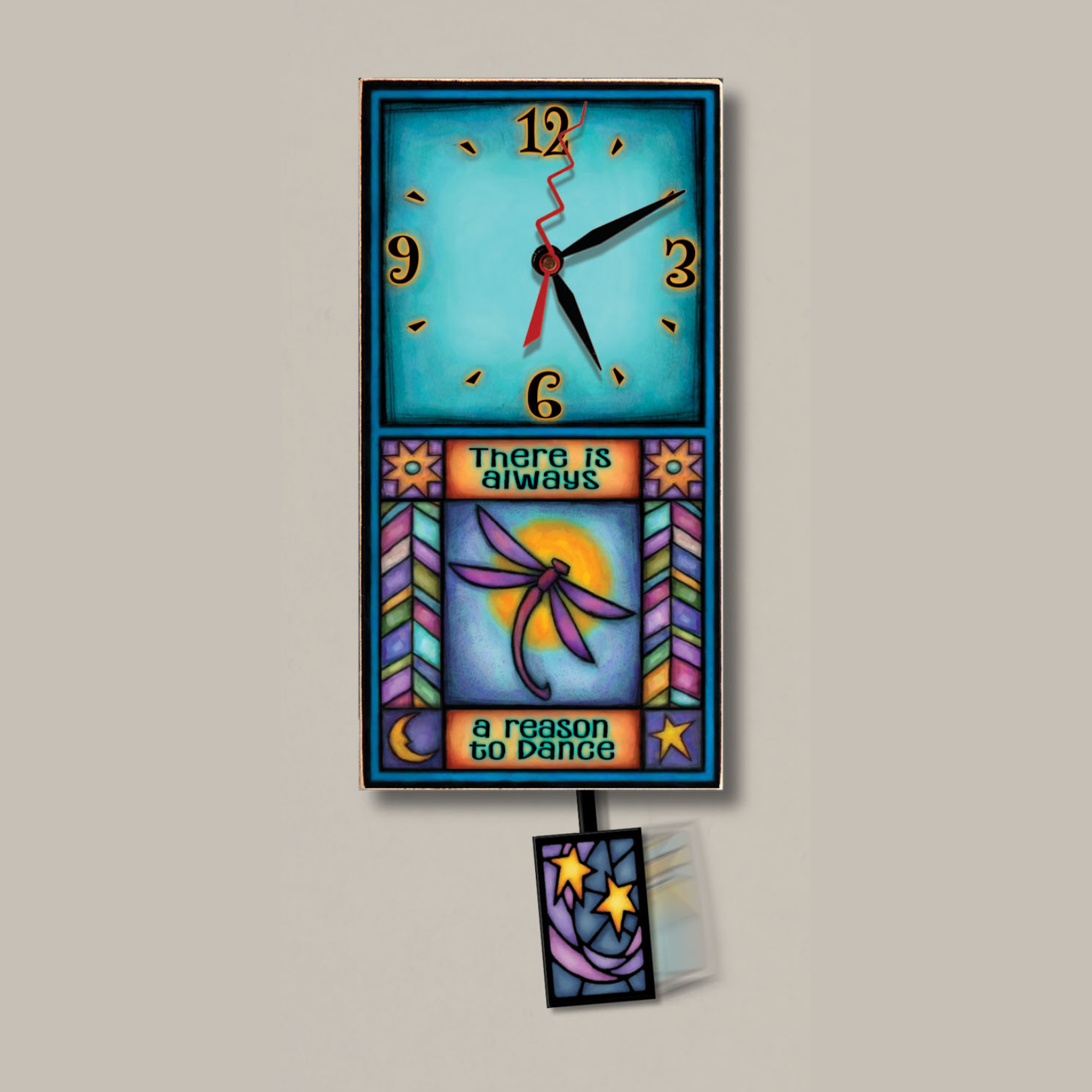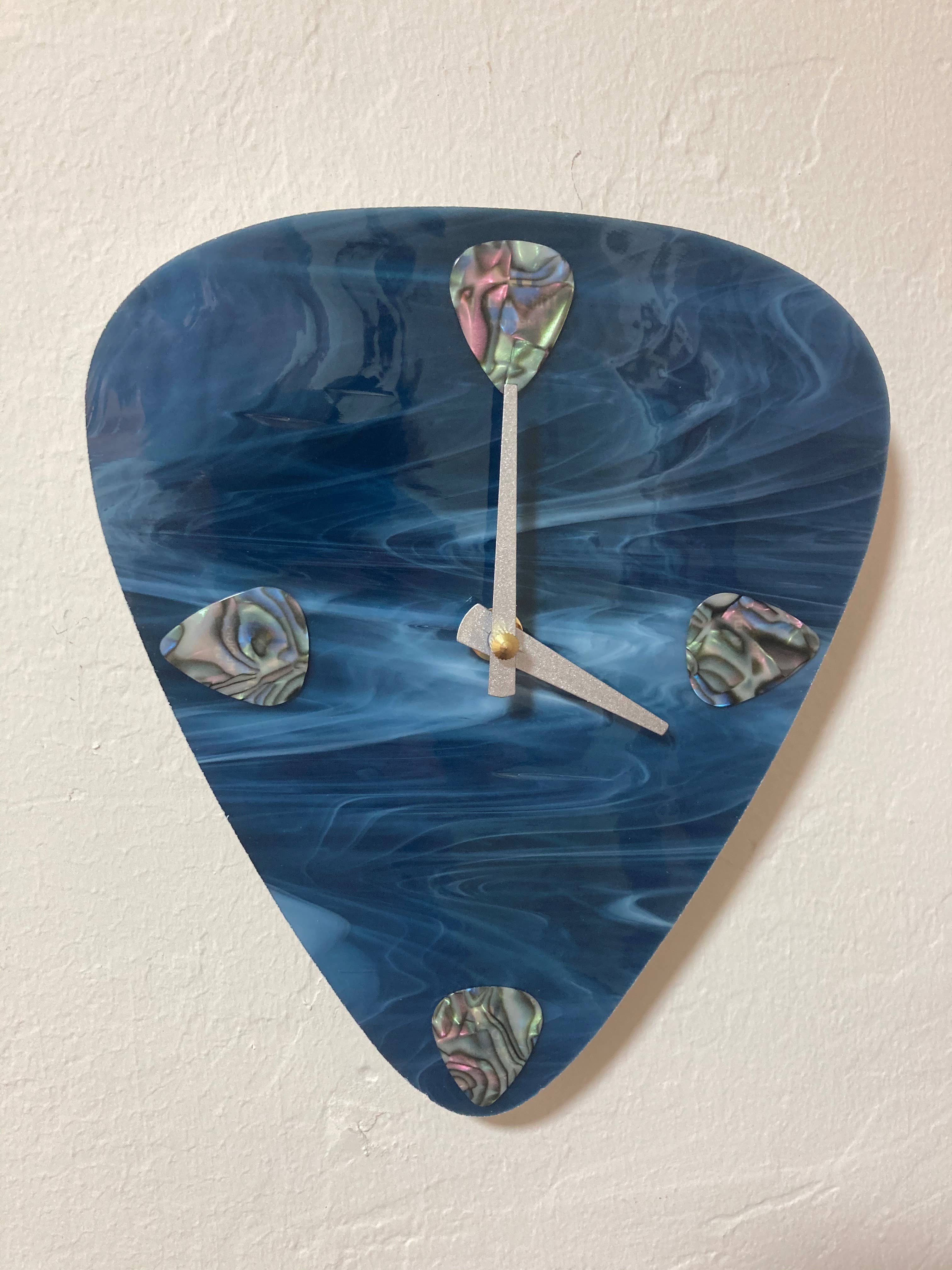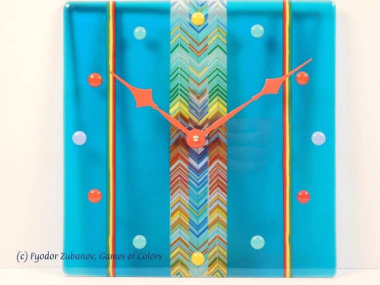 This elegant beautiful wall clock looks like popular candies laying on a blue transparent surface, like in a blueberry juice. No numbers, just blue, green, yellow and white pebbles "candies". Red hands enhance this illusion and compliment color harmony. A center part is a unique combination of stripes and may differ from the shown. The clock may find their place in any room. The silent clock movement is battery powered. Dimensions: 11 x 11 inches".