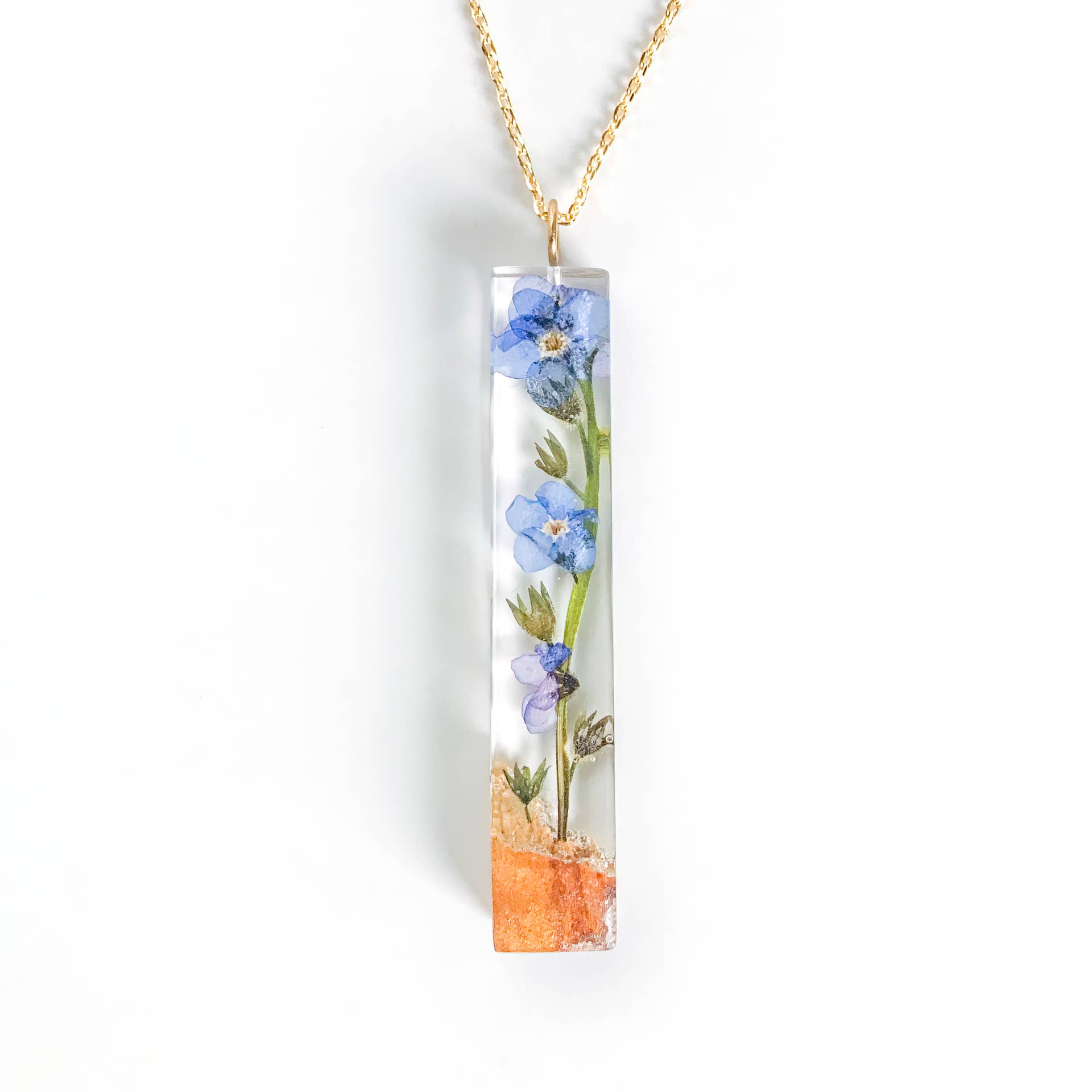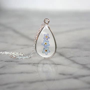 This teardrop pendant features three tiny blue forget-me-not flowers encased within jewelry grade resin.