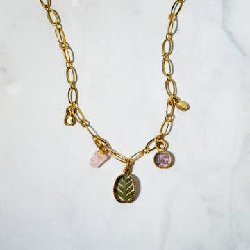 Chunky charm chain necklace sprinkled with stones and whimsy. Handmade in Guatemala in a fair trade workshop. A brass chain with a lobster clasp and gold plated brass charms. Adjustable 17 inch necklace