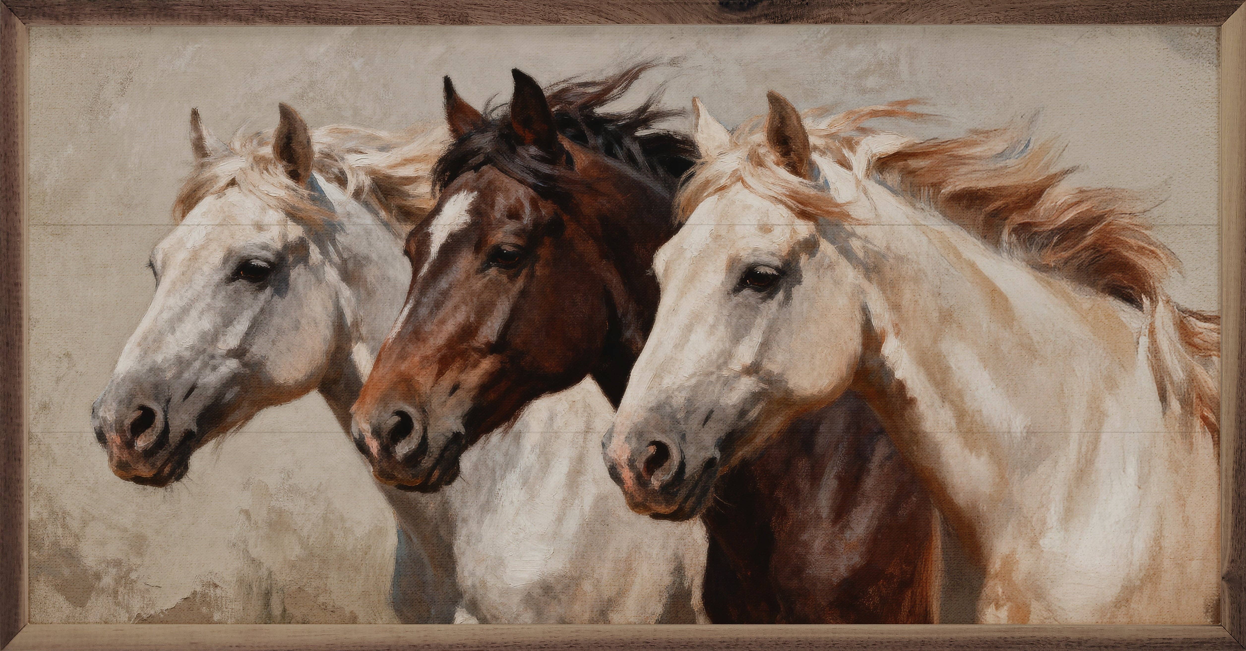 Abstract Brown Horse Pair Canvas Wall Art Design By White Ladder. Our stretched canvas is created with the highest standards. We use only the highest quality inks and canvas on our in house Mimaki printers, and then hand cut and stretch each piece over a 1.5 inch thick wooden frame for hanging. Made In USA.