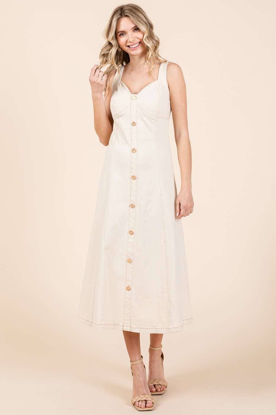 -Tencel woven -V-Neck line -Sleeveless -Adjustable spaghetti strap -Button down front -Maxi length -Imported Handwash 100% Tencel Model is 5'7" and wearing a size Small.
