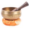 Crafted with top-quality brass, this singing bowl features an intricate design and produces rich, soothing tones. It's deep walls and smooth curves amplify the sound, creating a serene environment. Used for meditation, mindfulness, yoga, or as a decorative piece. This includes a wooden striker and cushion. Bowl Dimensions: 3" diameter, 1.75" tall