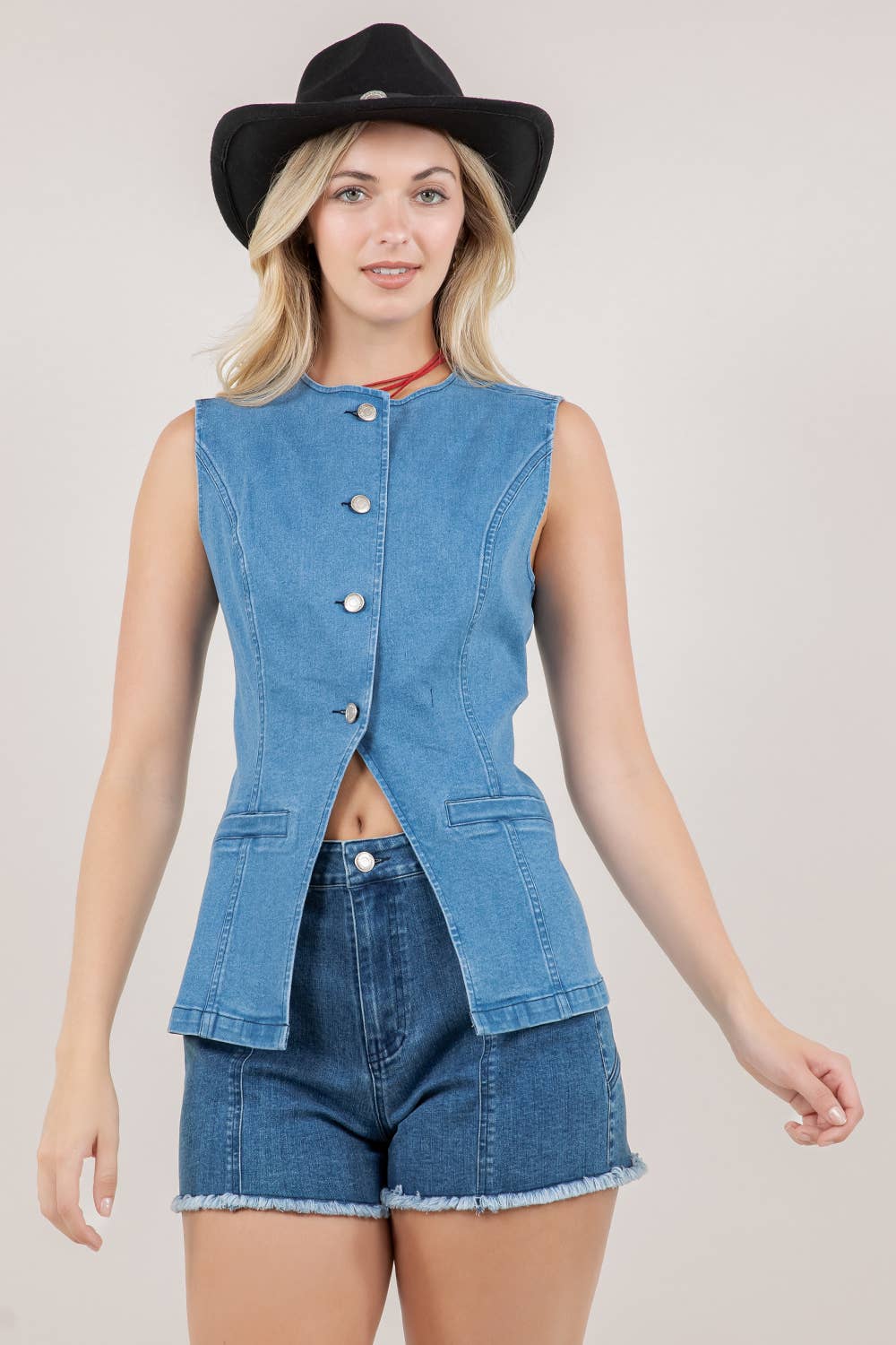 ***Image usage is allowed to the buyers who purchase from us via Faire only. SI-27354 Denim Vest Top This versatile vest adds a modern twist to any outfit, featuring a classic button-up design and a flattering V-neckline. - Front Welt Pockets - Buckle Adjustment At Back - Front Button Closure Material: 72% COTTON 24% POLYESTER 3% RAYON 1% SPANDEX SI-27833 Stretch Denim Vest (75% COTTON 23% POLYESTER 2% SPANDEX) AnchorBestseller SI-19669 Double ruffle detail washed denim vest w/ snap button (100% denim) Denim grey-154715 SI-28311 Denim Vest w/ Pockets (100%COTTON) LIGHT-185845 SI-27354 Denim Vest Top (72% COTTON 24% POLYESTER 3% RAYON 1% SPANDEX) BLACK-177823 BLUE-178906 LT.BLUE-178907 WHITE-178908