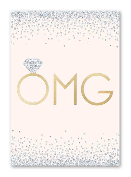 FRONT: OMG! INSIDE: blank DETAILS: • Dimensions - one 5x7 folded card • Paper - 100# natural cardstock, 100% recycled • faux gold foil accents • Envelope - aqua recycled envelope (A7) • Packaging - sealed in a clear sleeve