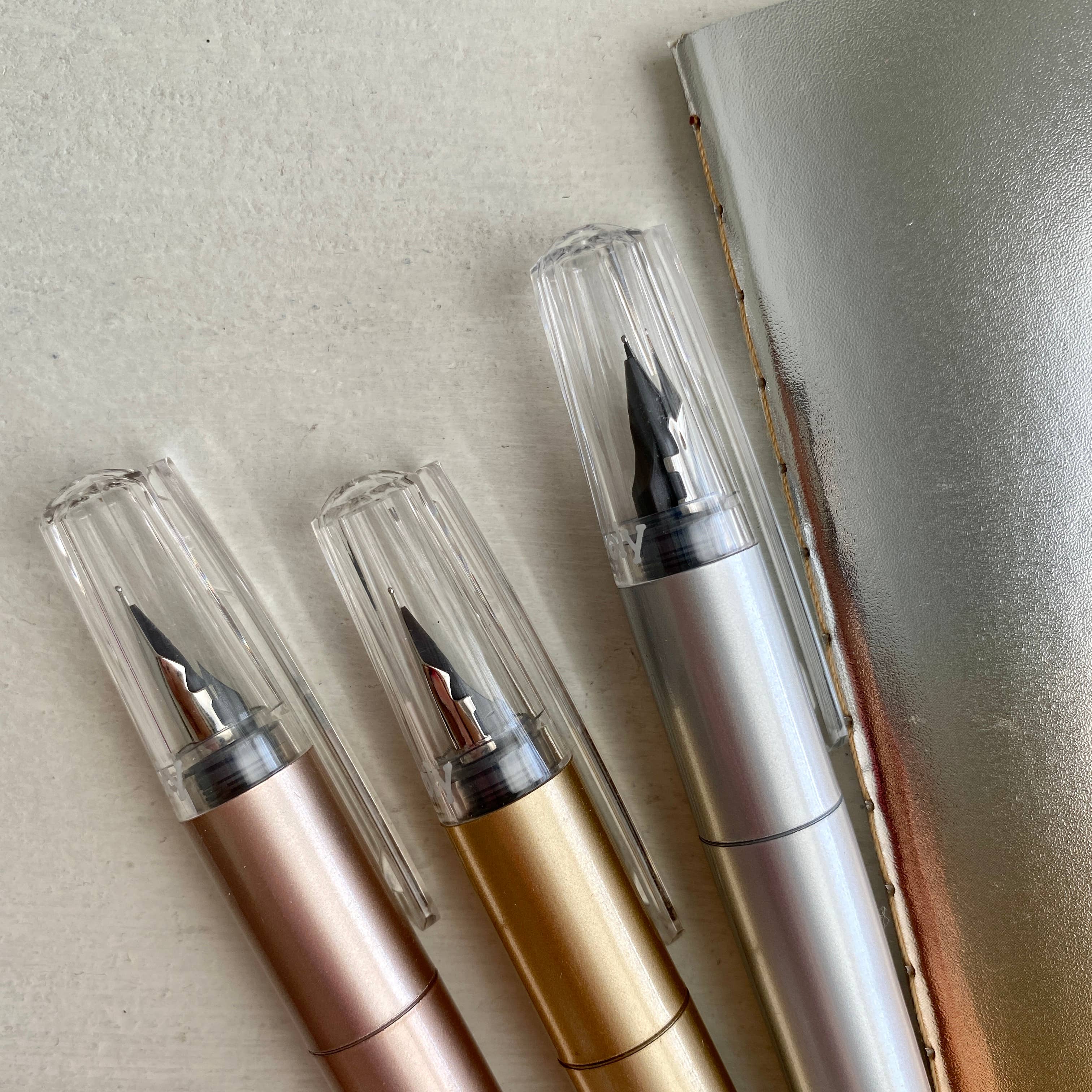Modern Script Fountain Pen & Journal set includes 3 black ink fountain pens in Gold, Rose Gold, and Silver, plus a 60 page Gold & Silver ombré covered journal. 3 black ink fountain pens in gold, rose gold and silver 60 page journal (3.7 x 5.8 inches) with silver and gold ombre foil cover Works with Splendid Fountain Pen refills Pairs nicely with Modern Graphite Pencils Suitable for ages 12 and up