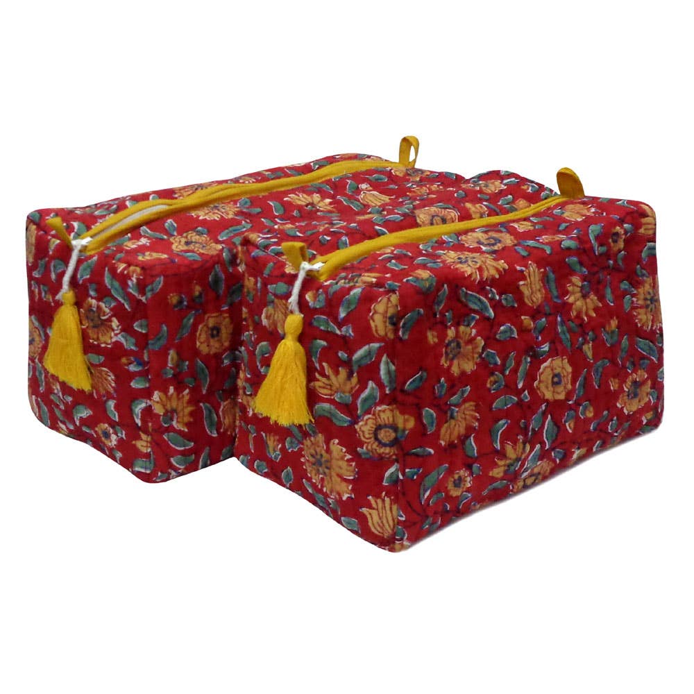 Our hand-block printed cotton quilted makeup/toiletry bags are the perfect addition to any beauty routine or travel kit. Made with high-quality cotton and hand-printed with intricate designs, these bags are both functional and stylish. The set includes two bags, one medium, and one large, all with inner pockets, giving you plenty of options for storing all your essentials. The bags feature a durable zipper closure to keep your items secure. The bags are also fully lined with a waterproof lining to protect against any spills. SIZE Large : 30 cm (Length) x 10 cm (Width) x 13 cm (Height) Medium: 20 cm (Length) x 8 cm (Width) x 10 cm (Height)